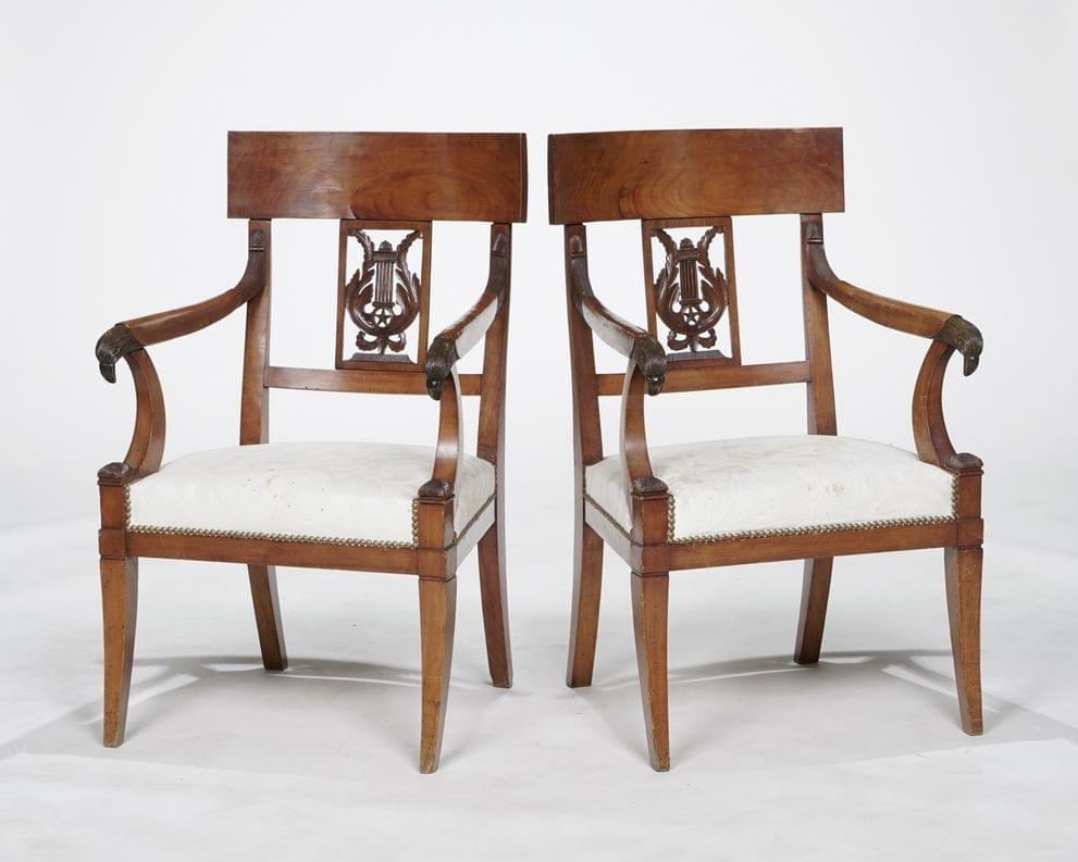 Dossier à bandeau ajouré d'un motif lyre, accotoirs en tête d'oiseau bois fruitier