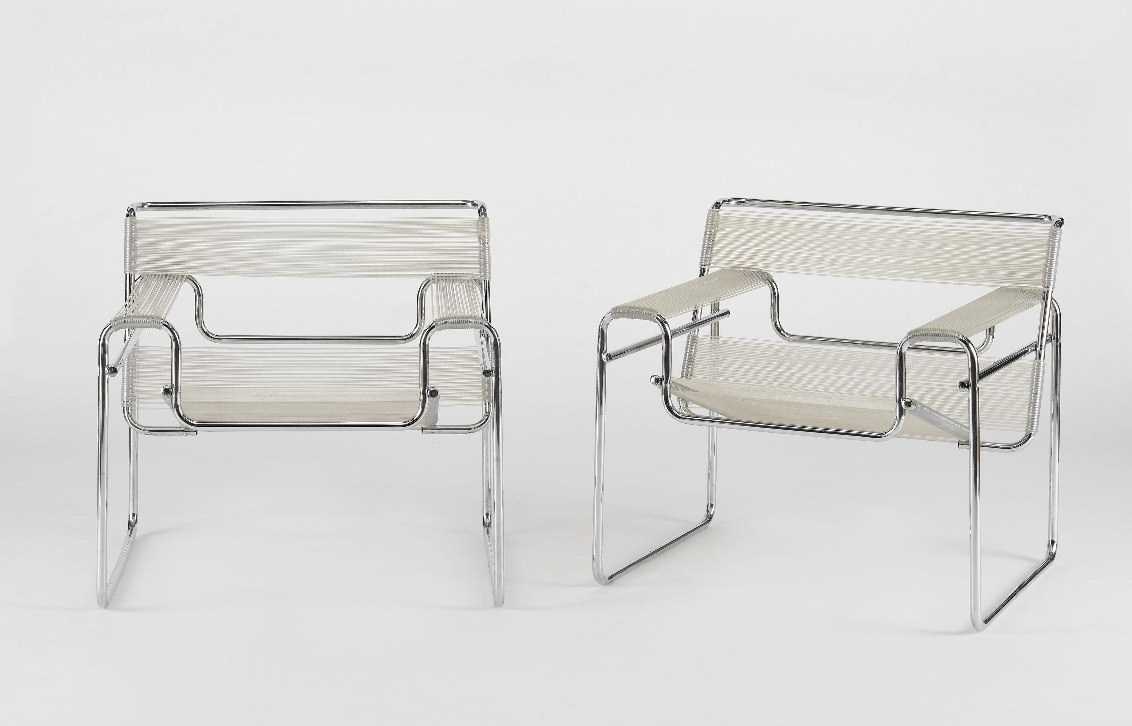 Structure tubulaire en métal chromé, assise en corde synthétique