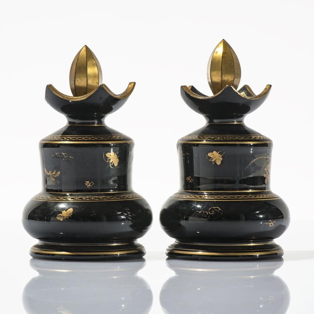 90. Paire de saupoudroirs, deux bouteilles et un flacon en verre gra...