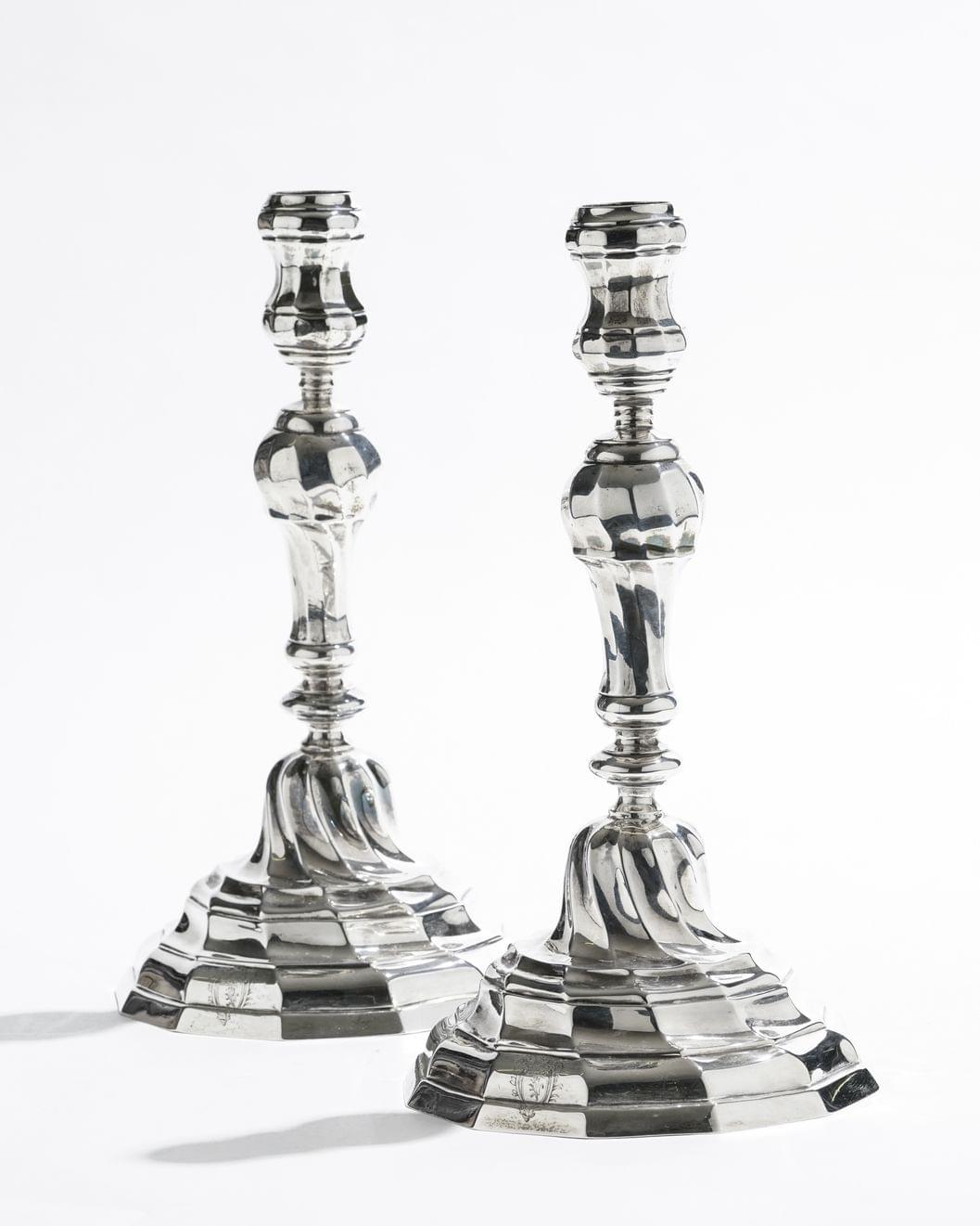 395. Paire de flambeaux balustres à festons torses armoriés