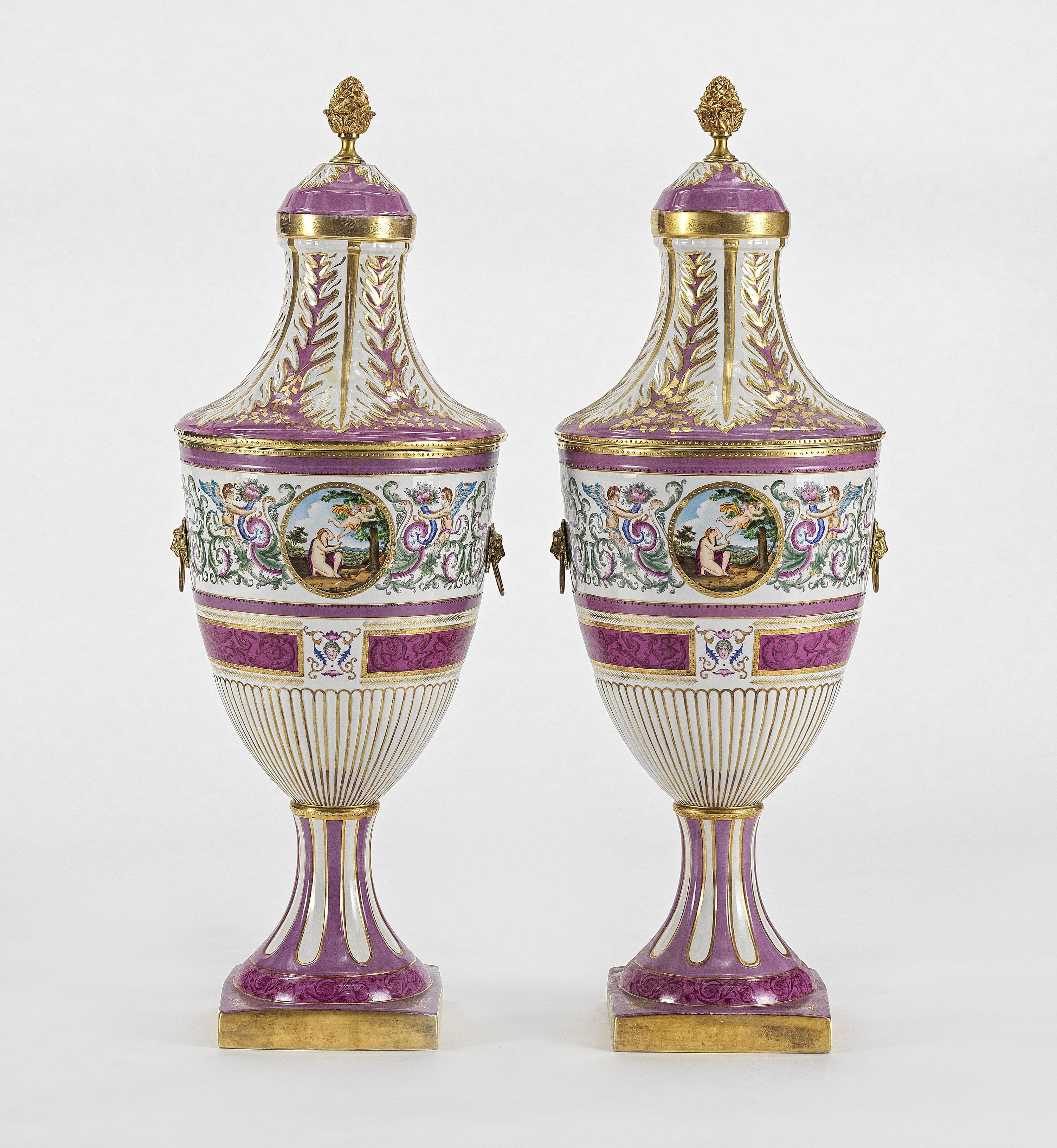 Porcelaine émaillée polychrome à motifs d'une frise de grotesques et scènes dans des médaillons sur fond blanc et aubergine, filets or, H 104 cm