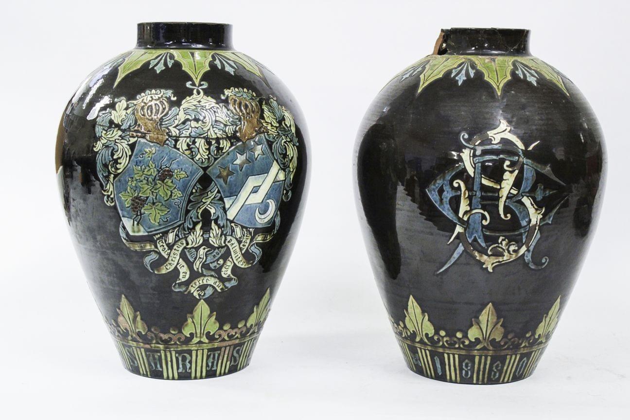 Faïence émaillée polychrome à décor d'armoiries sur fond brun, H 39 cm
