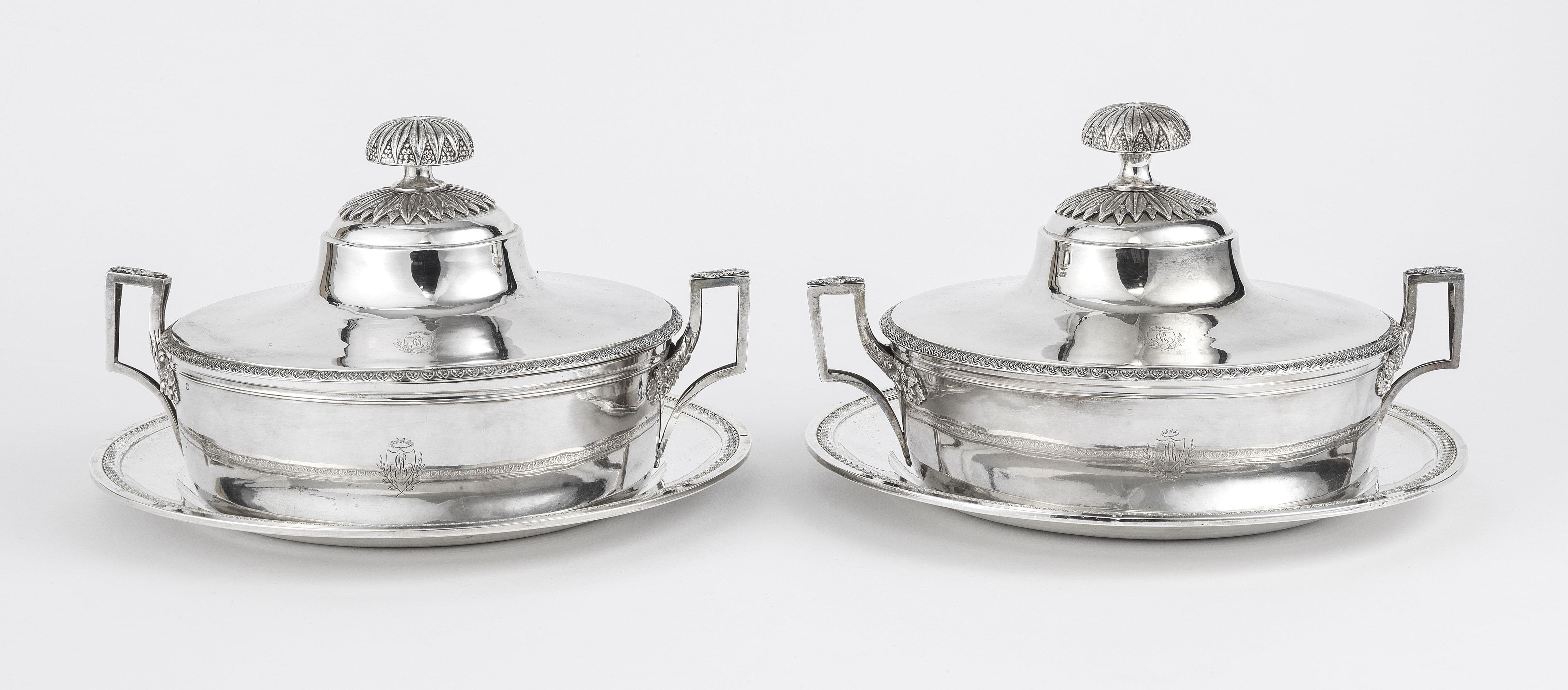 139. Paire de légumiers néoclassiques d'époque Empire et Restauration à prise de palmes et bordure de palmettes, sur présentoirs