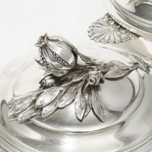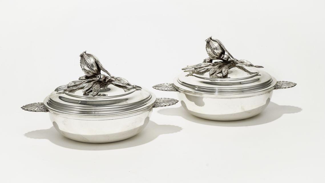 421. Paire de légumiers ronds à oreilles palmette et prise grenade