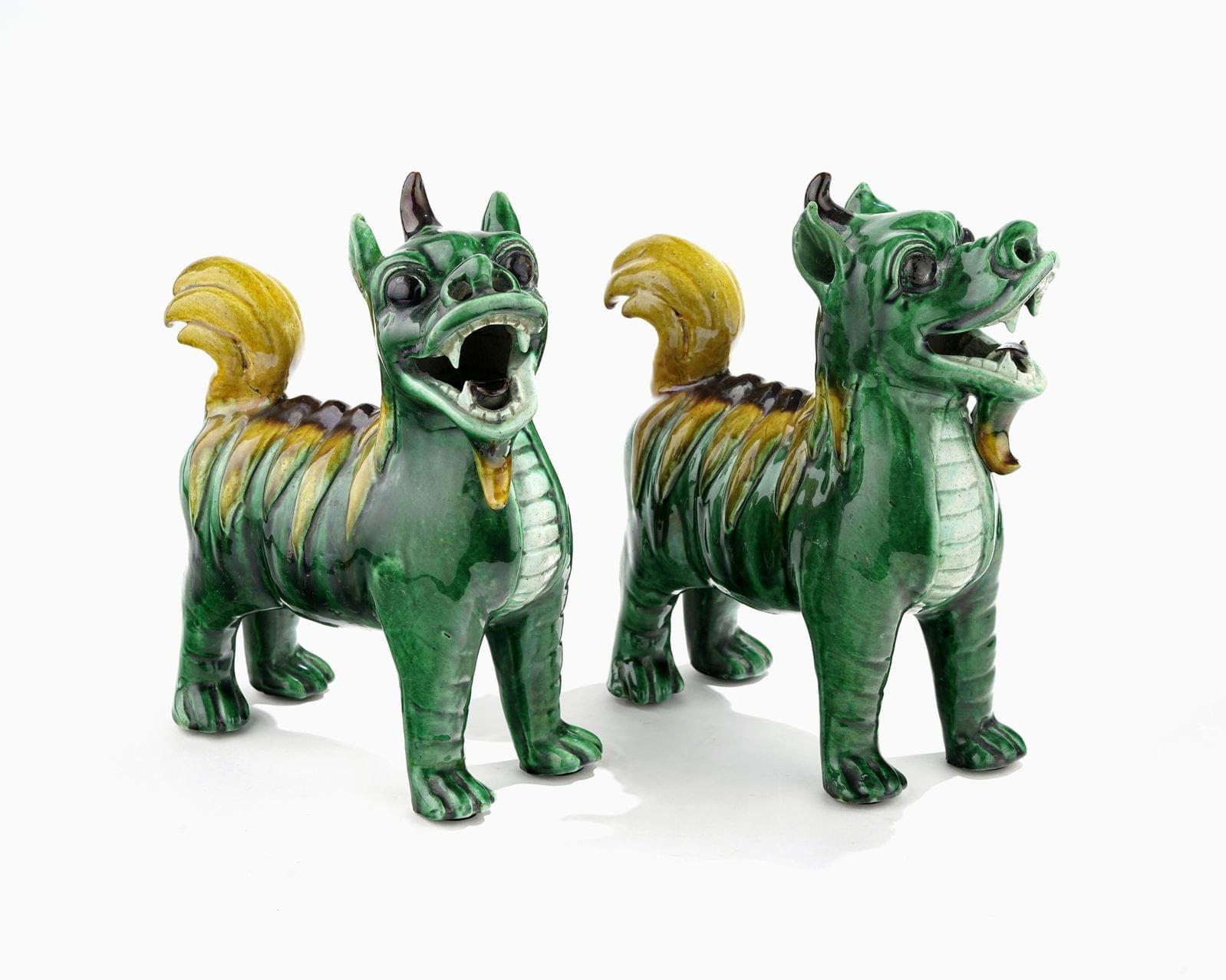 844. Paire de licornes/chien de Fô à émaux sancai, Chine, dynastie Qing (1644-1912), époque Kangxi (1662-1722)