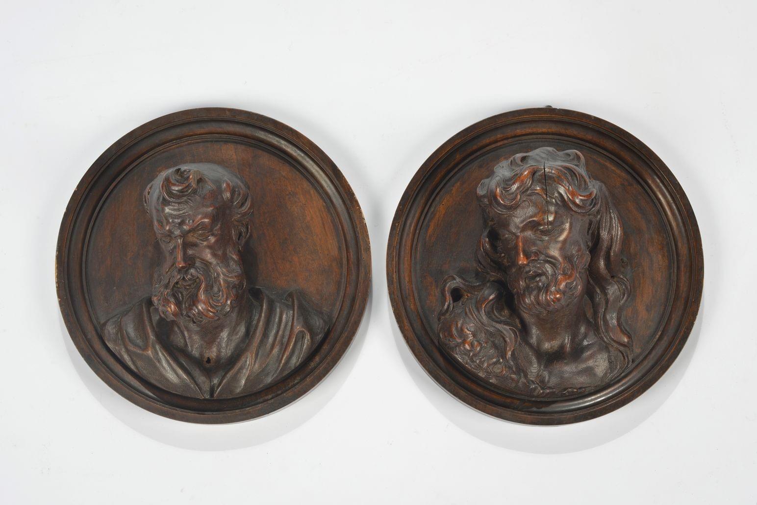 Noyer sculpté, XVIIIème s, représentant les têtes du Christ et de Saint Pierre. D36 cm