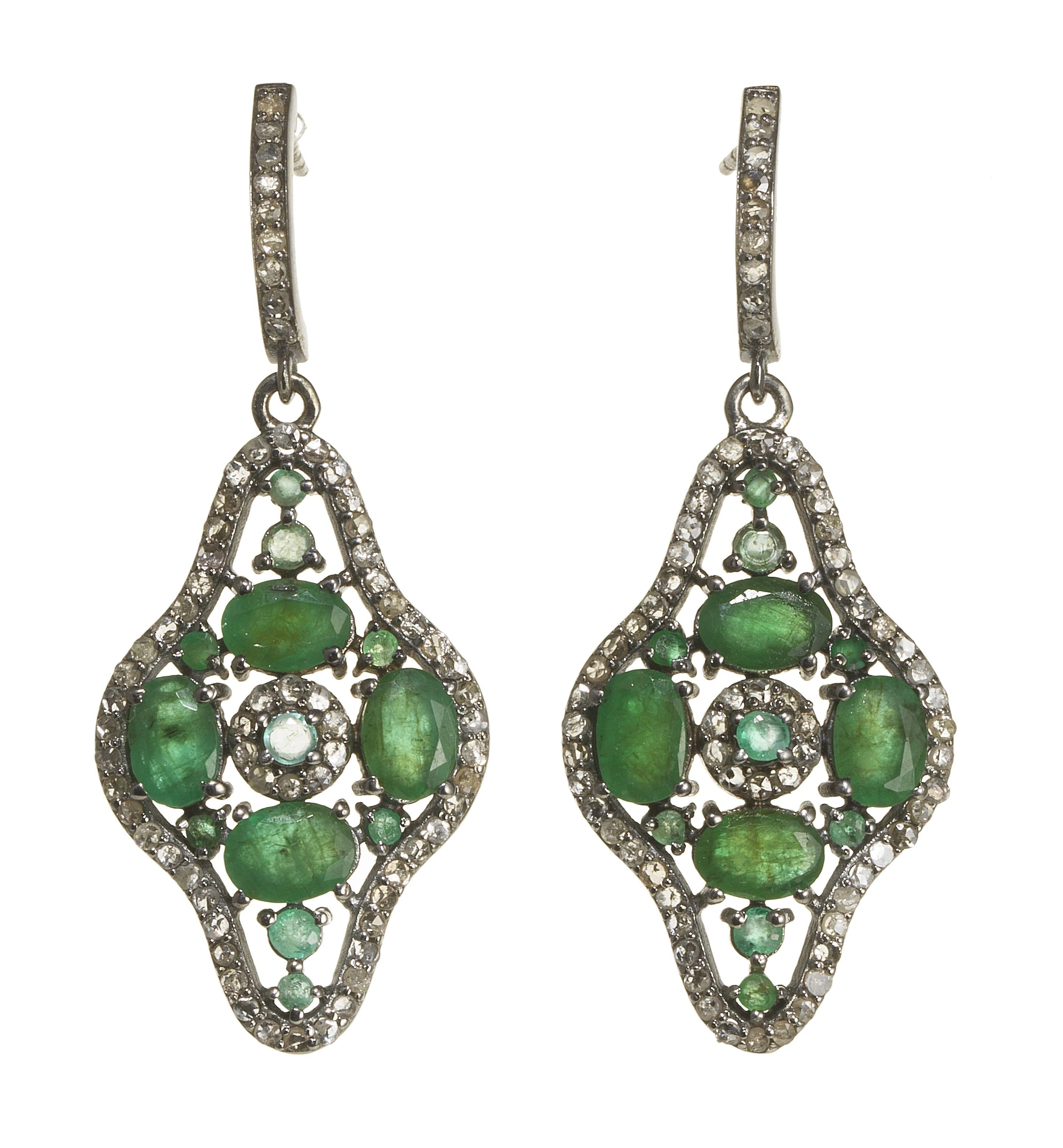 3073. *Paire de pendants d'oreilles ajourés pavés d'émeraudes taille ovale et de roses de diamant