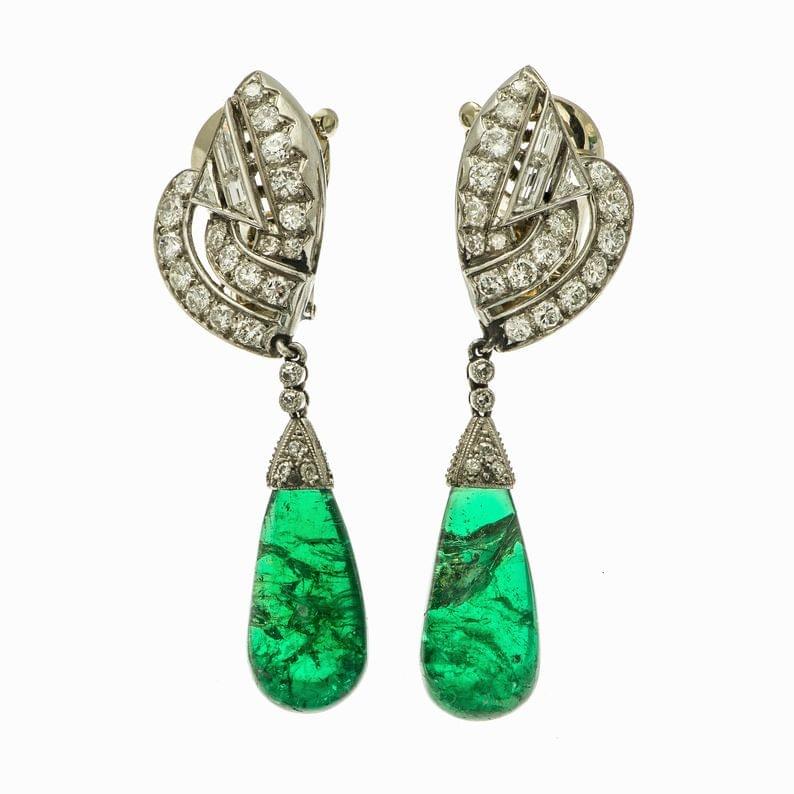 421. Paire de pendants d'oreilles Art Déco sertis de diamants et retenant des gouttes d'émeraudes