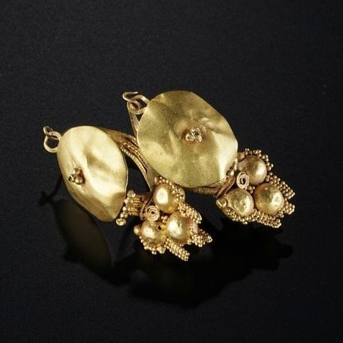 A décor d'un disque bombé surmontant un motif de grappe travaillé en granulation, or jaune, 10,4 g. Provenance: Collection privée suisse