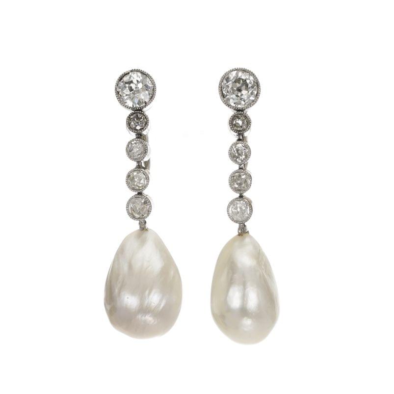 221. Paire de pendants d'oreilles sertis de diamants taille ancienne en chute (env. 1 ct) et retenant l'un une perle baroque, l'autre une perle de nacre