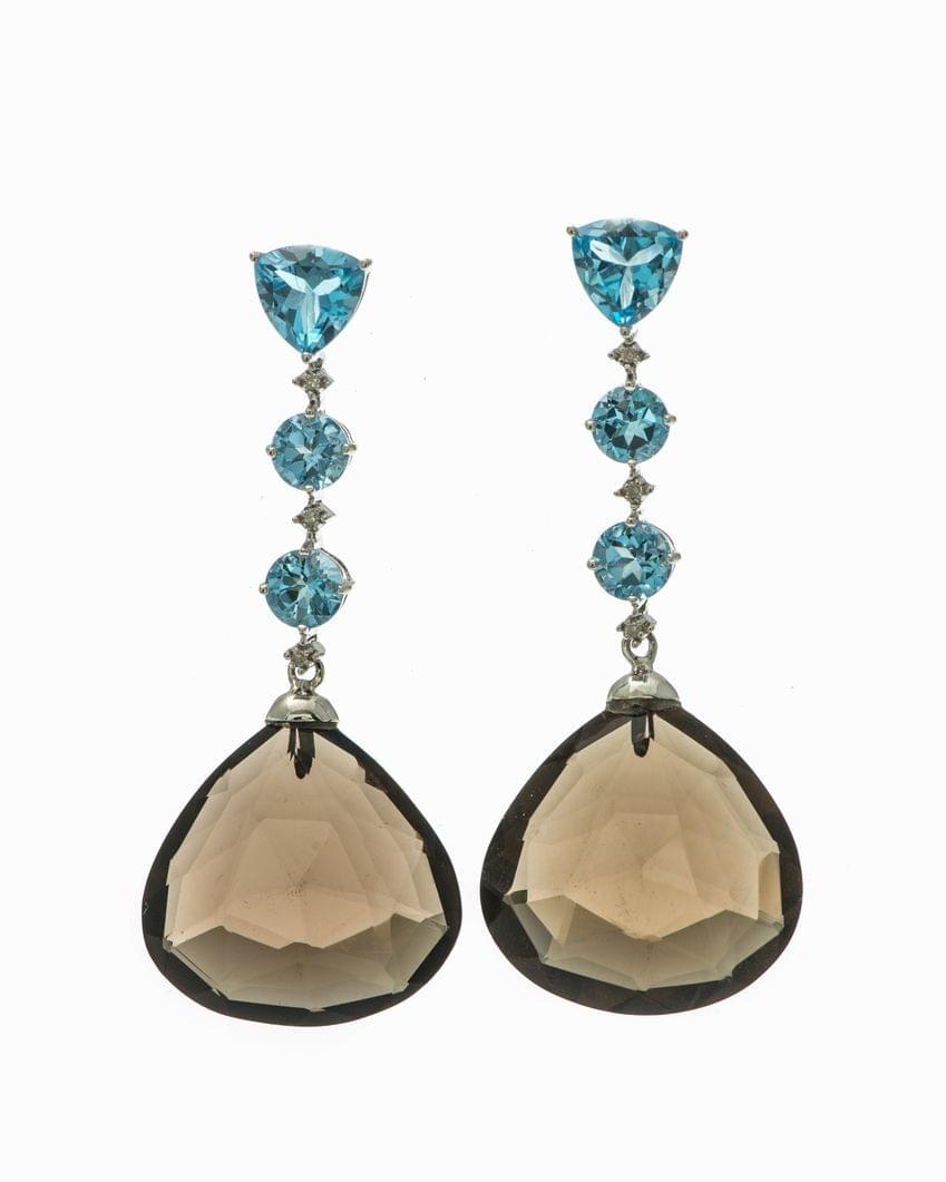 470. Paire de pendants d'oreilles sertis de quartz fumé rehaussés de topazes bleues et diamants