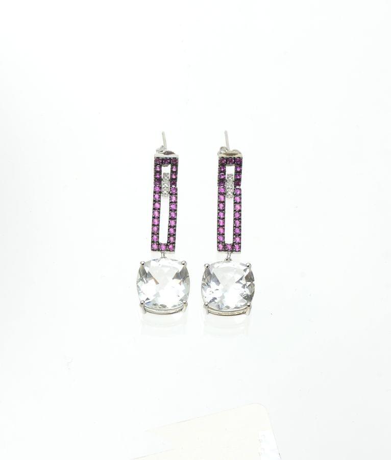 323. Paire de pendants d'oreilles sertis de rubis et diamants retenant une topaze incolore