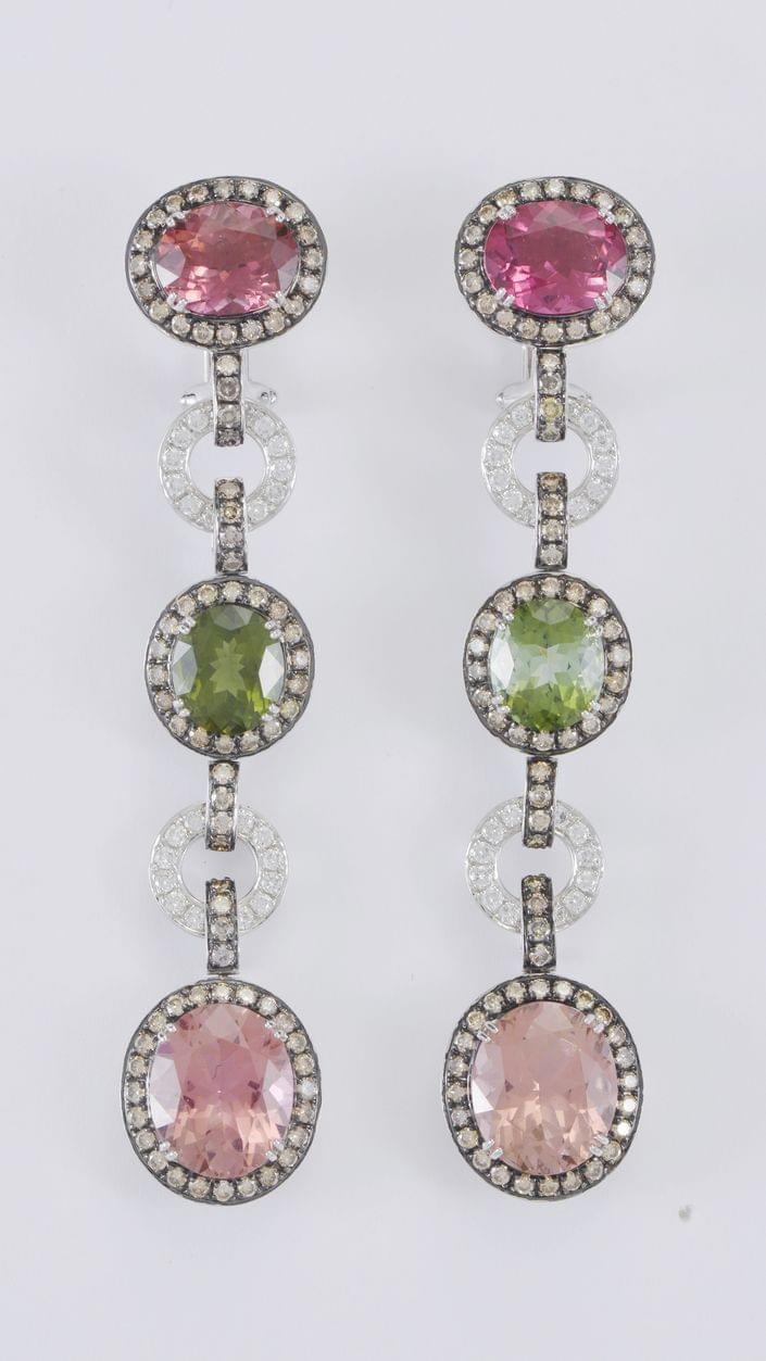78. Paire de pendants d'oreilles sertis de tourmalines roses et vertes entourées de diamants bruns et reliées par des éléments ronds sertis de diamants blancs