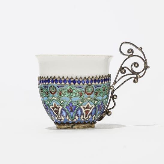 3662. Paire de petites tasses à anses volutes à décor en émail cloisonné de végétaux stylisés, Karl Fabergé, 88 zolotniks, H 5 cm