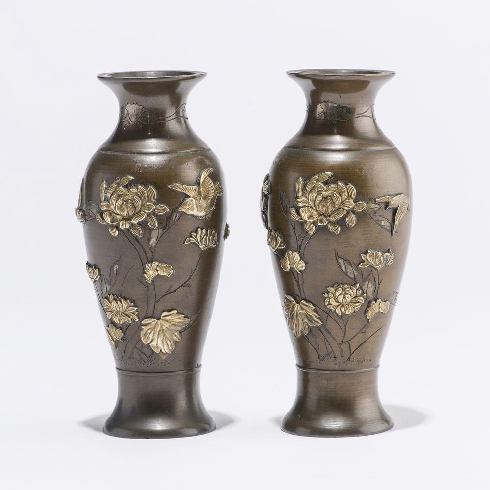 Bronze à inclusions or et argent, à décor de fleurs et d'oiseaux en relief, Japon, époque Meiji (1868-1912), H 15 cm