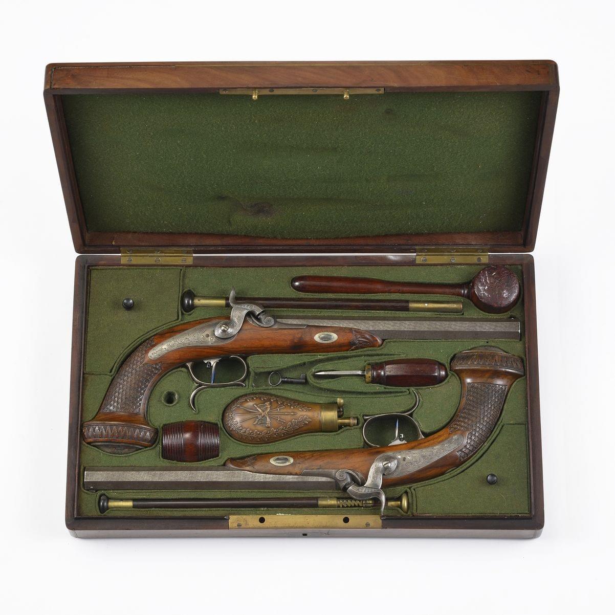 Coffret aux armes de la famille Troubetzkoï (Трубецкой), canon en damas gris, acier et acier bleui, noyer veiné, avec accessoires, époque Restauration, L 40 cm. L'armurier François Prélat étant actif sous la Restauration et le début du Second Empire, il est fort probable que cette paire de pistolets ait appartenu au Prince Serge Troubetzkoï (1790-1860), l'un des organisateurs de l'insurrection décabriste, tentative de coup d'Etat visant à obtenir du futur empereur Nicolas Ier une constitution.