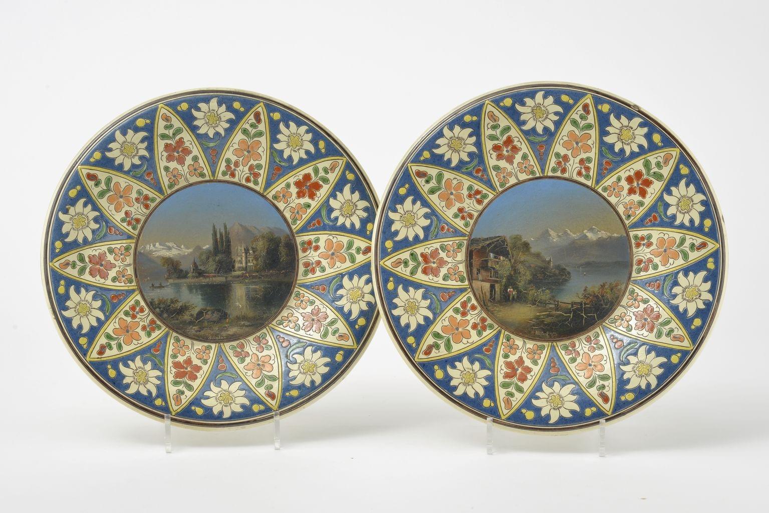 Terre vernissée à décor incisé de fleurs, centre peint de bords de lacs suisses notamment le château de Schadau