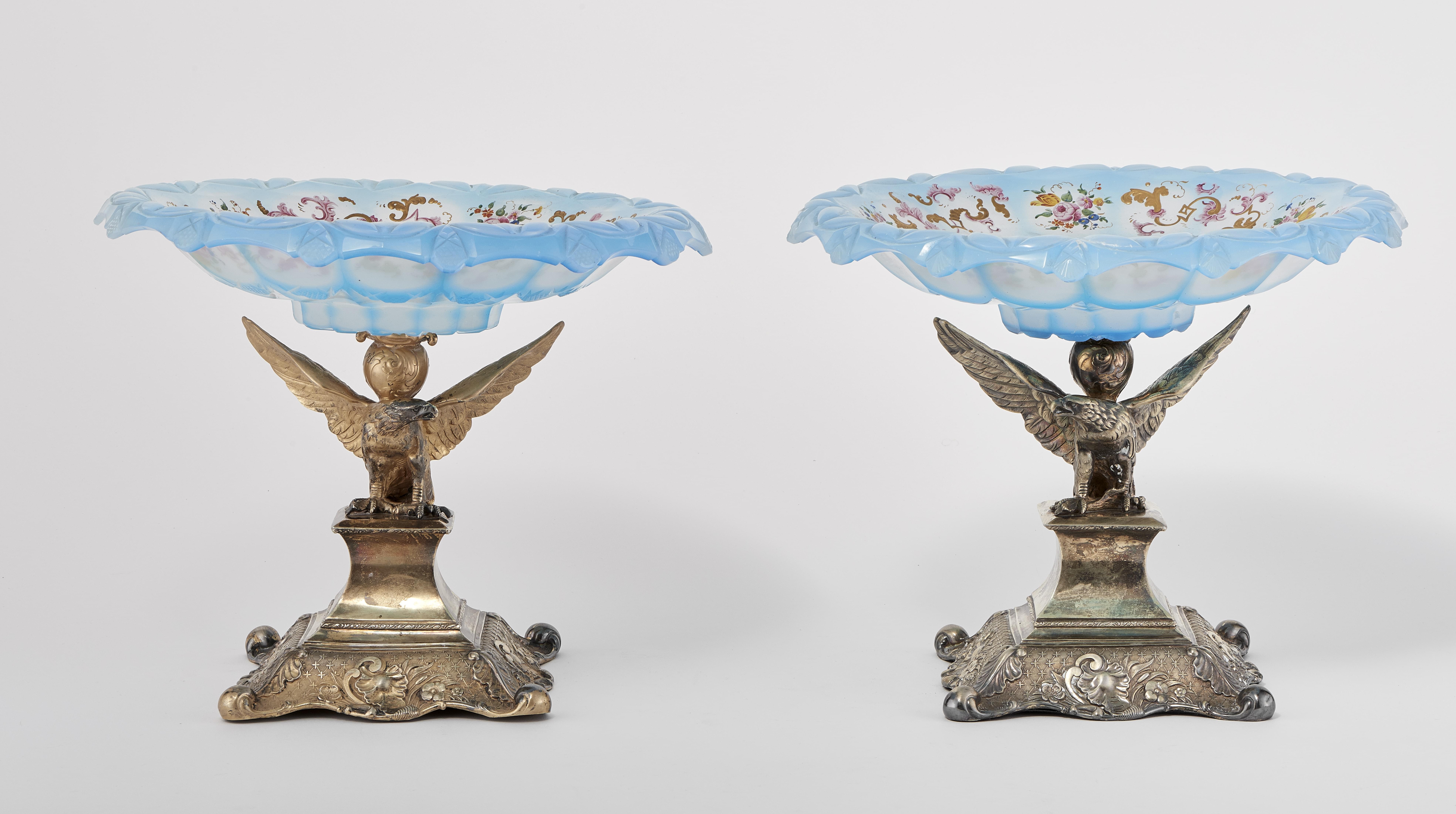 Bohème, XIXe s, opaline blanche, overlay bleu ciel, émaux polychromes et or, métal argenté, H 23 cm