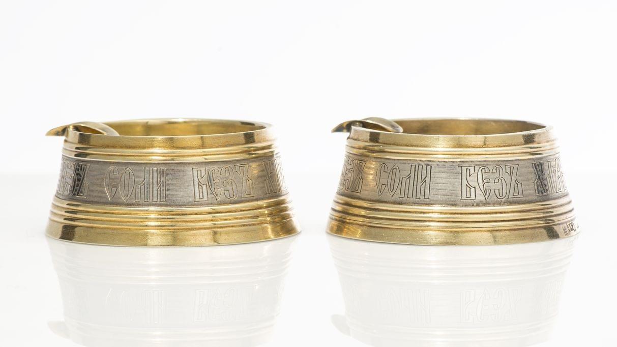 114. Paire de salerons à décor tonneau gravés "Без соли, без хлеба - половина обеда" (Sans sel, sans pain, c'est juste une moitié de déjeuner)