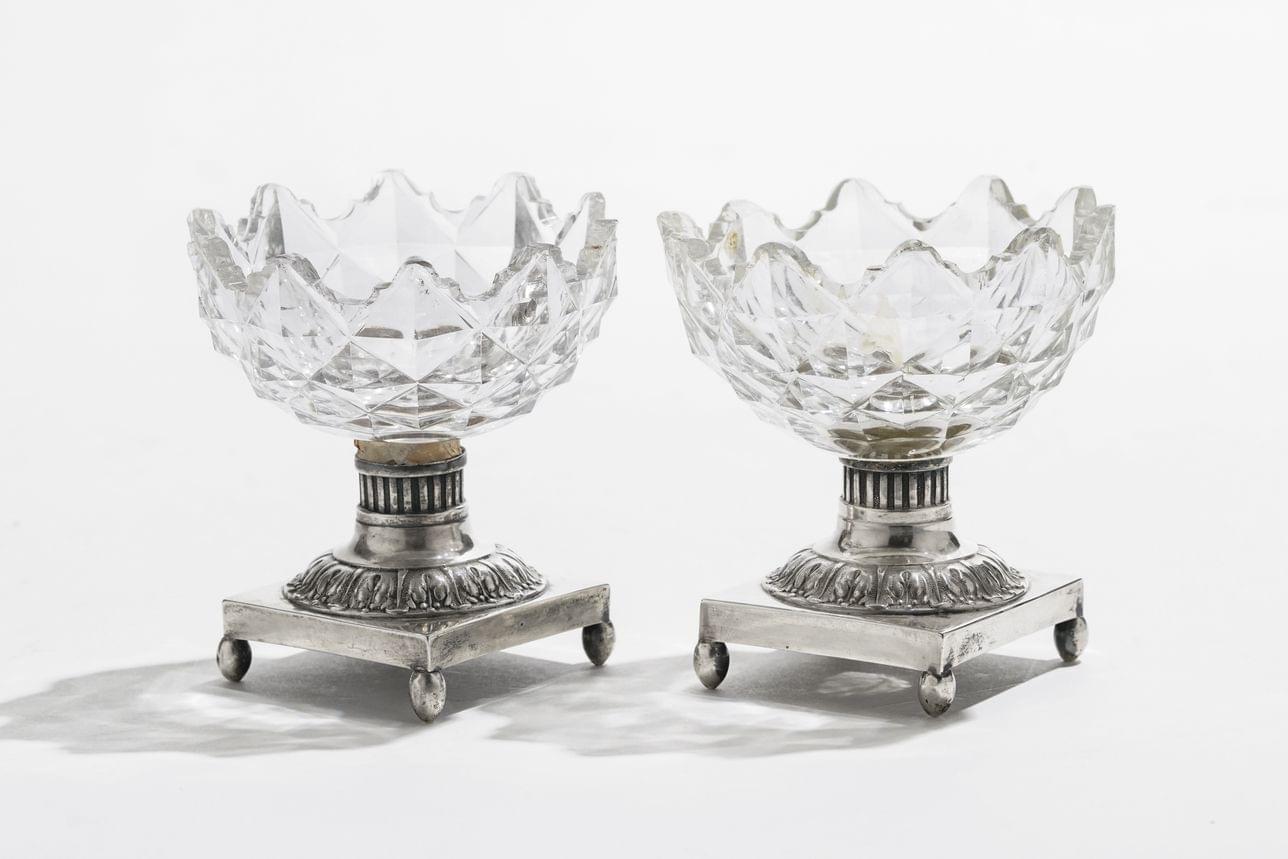 403. Paire de salerons néoclassiques en verre taillé sur pied à décor de feuilles d'eau sur base carrée,