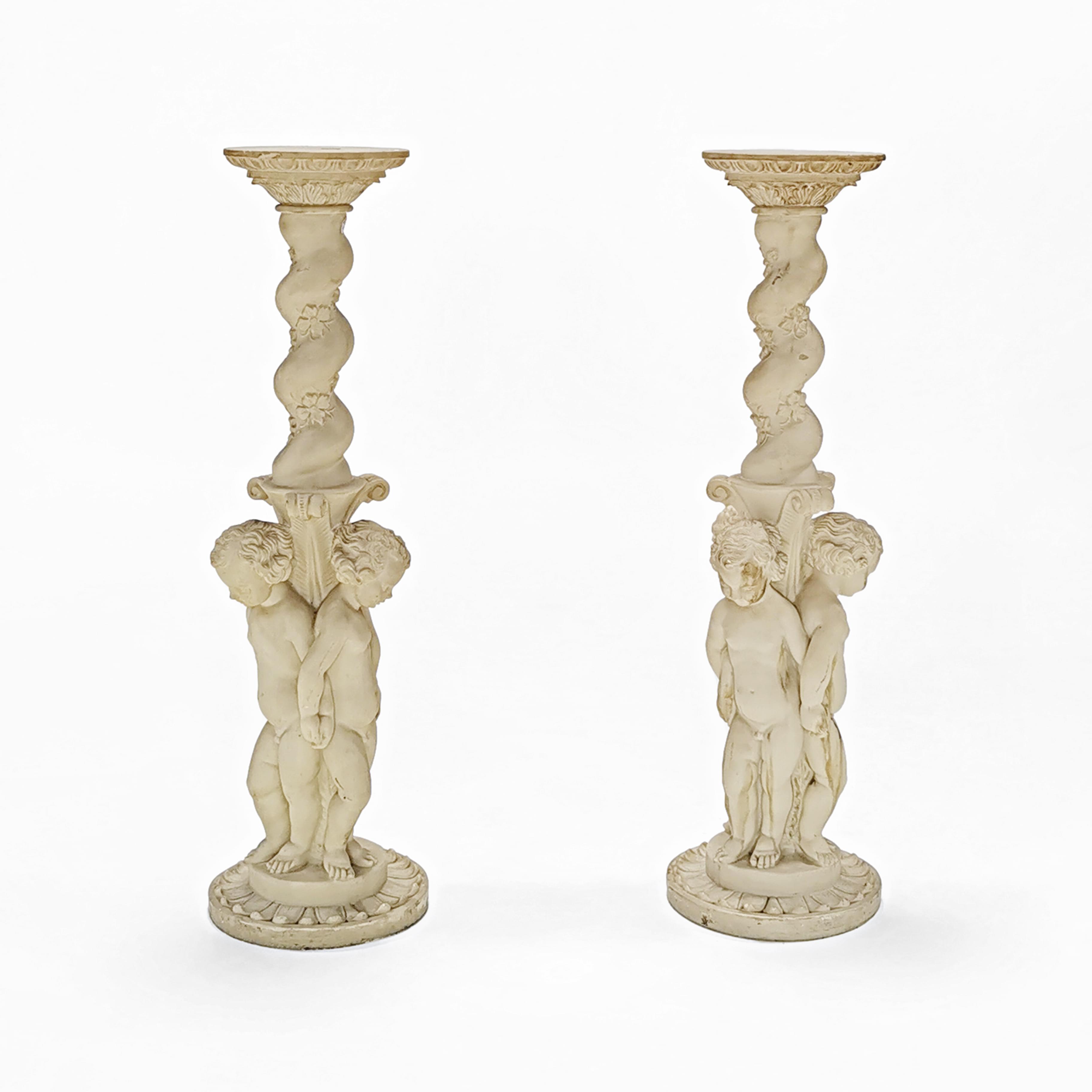 1. Paire de flambeaux à décor repoussé de larges fleurs et acanthes