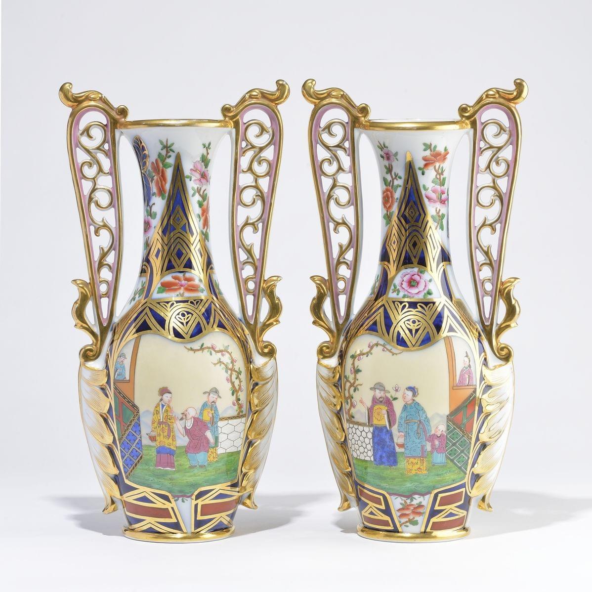 Porcelaine polychrome à décor d'une scène animée et d'un oiseau, Bayeux, période Frédéric Langlois, marqués FL, XIXe s, H 44 cm