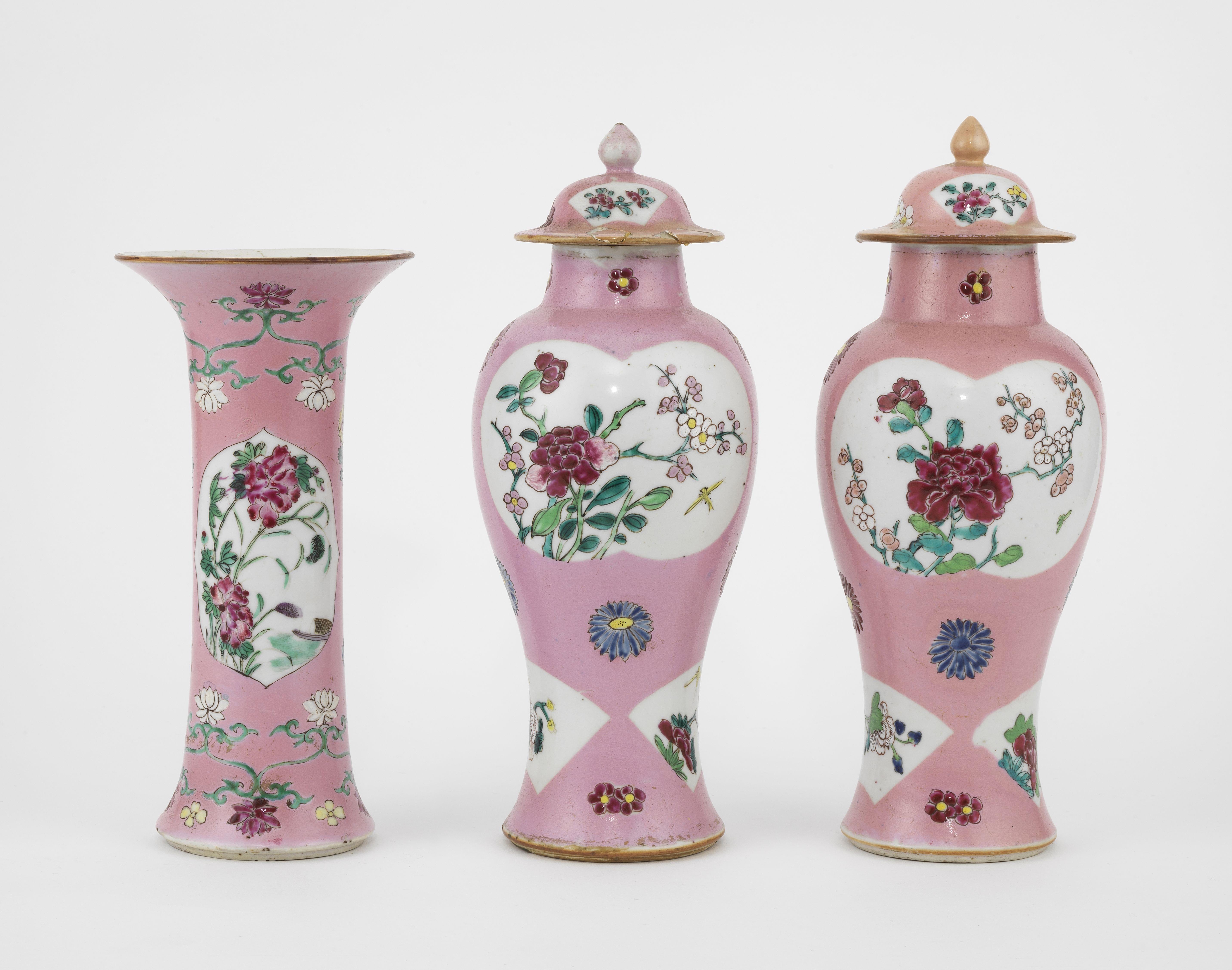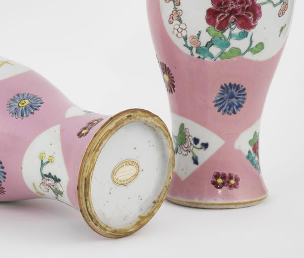 Porcelaine émaillée polychrome à motif de fleurs sur fond rose, H 23 à 29 cm. Provenance: Collection Heliot Fils à Paris selon une étiquette sous la base