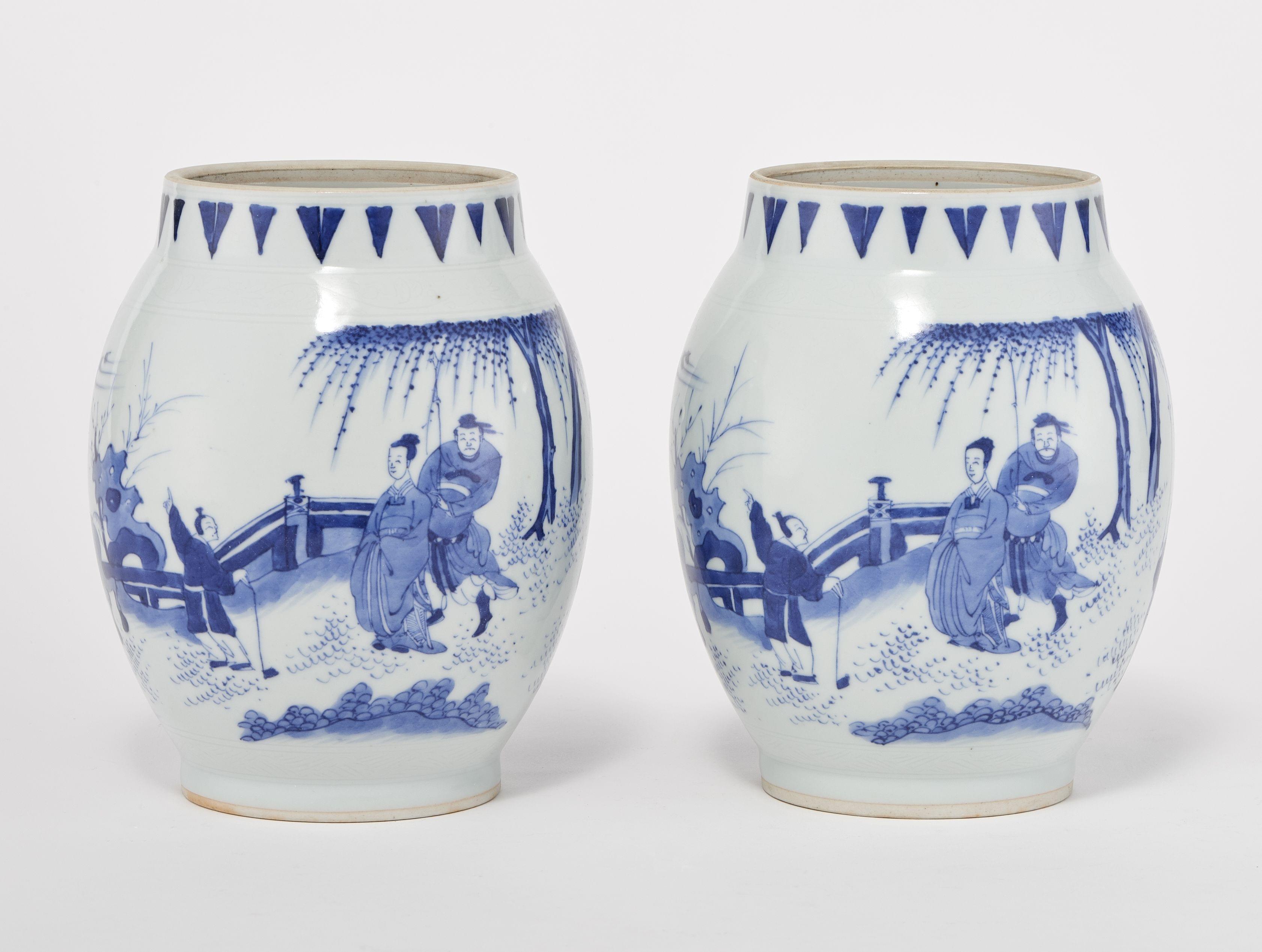 Porcelaine émaillée bleu blanc à décor de personnages dans un jardin, H 18 cm