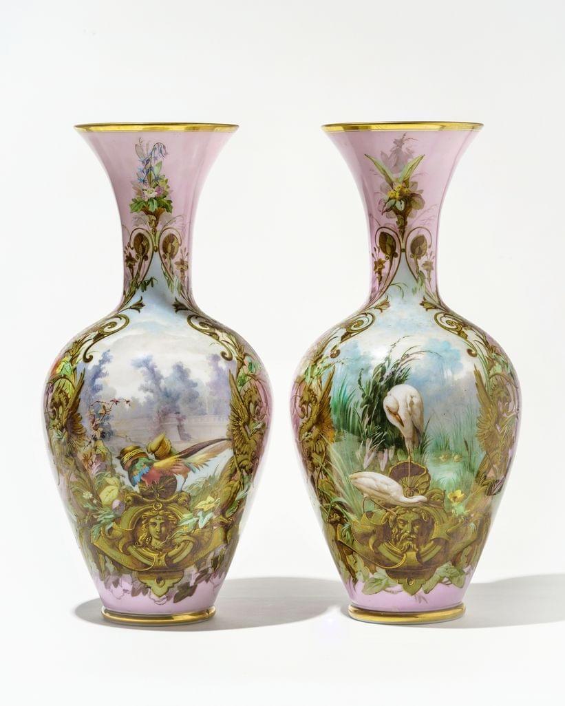 Opaline à riche décor peint de végétaux et perroquets, H 50 cm. Provenance: Château fribourgeois