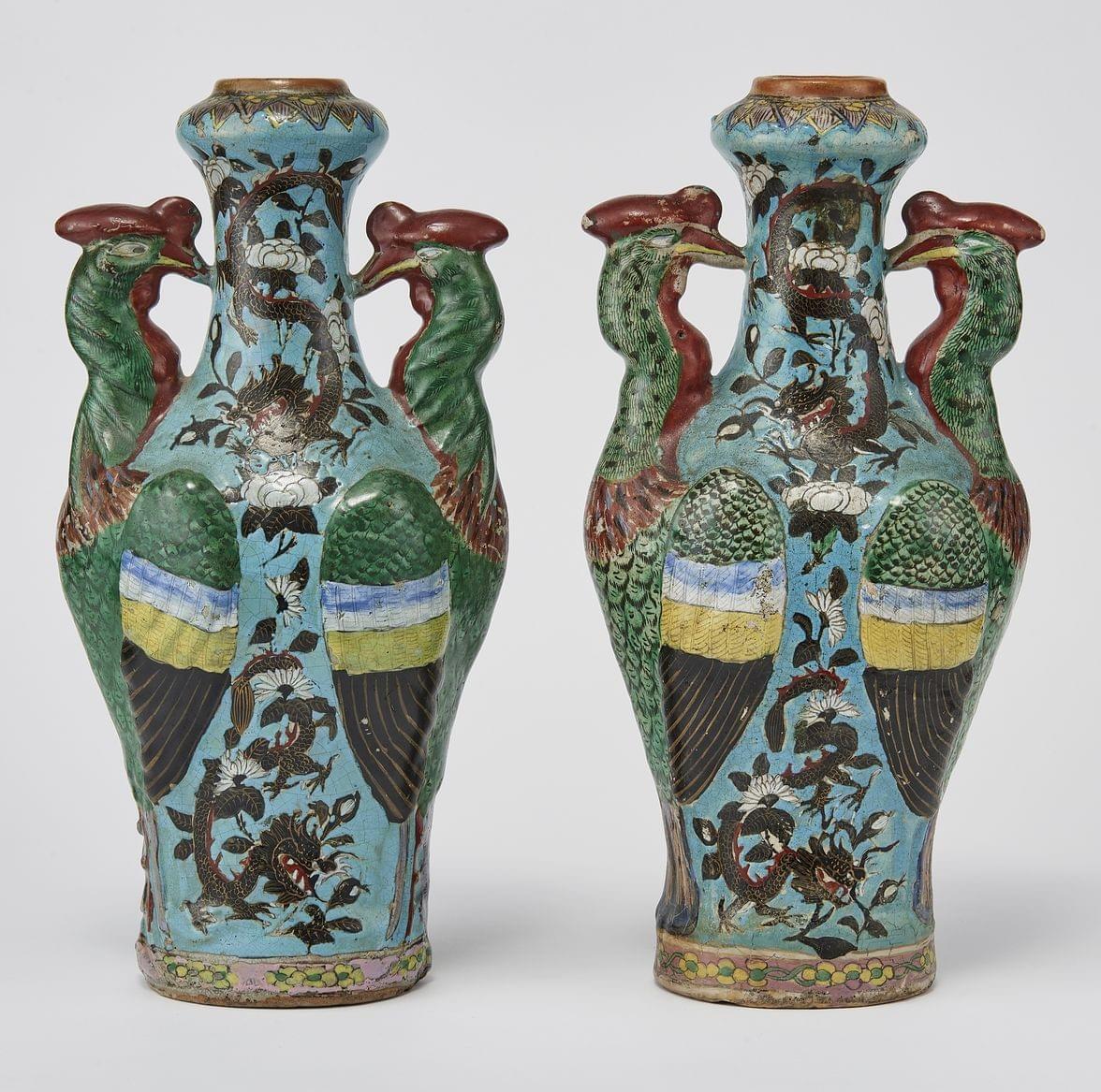 Céramique émaillée polychrome à décor de dragons sur fond turquoise, anses en forme de coq, H 30 cm