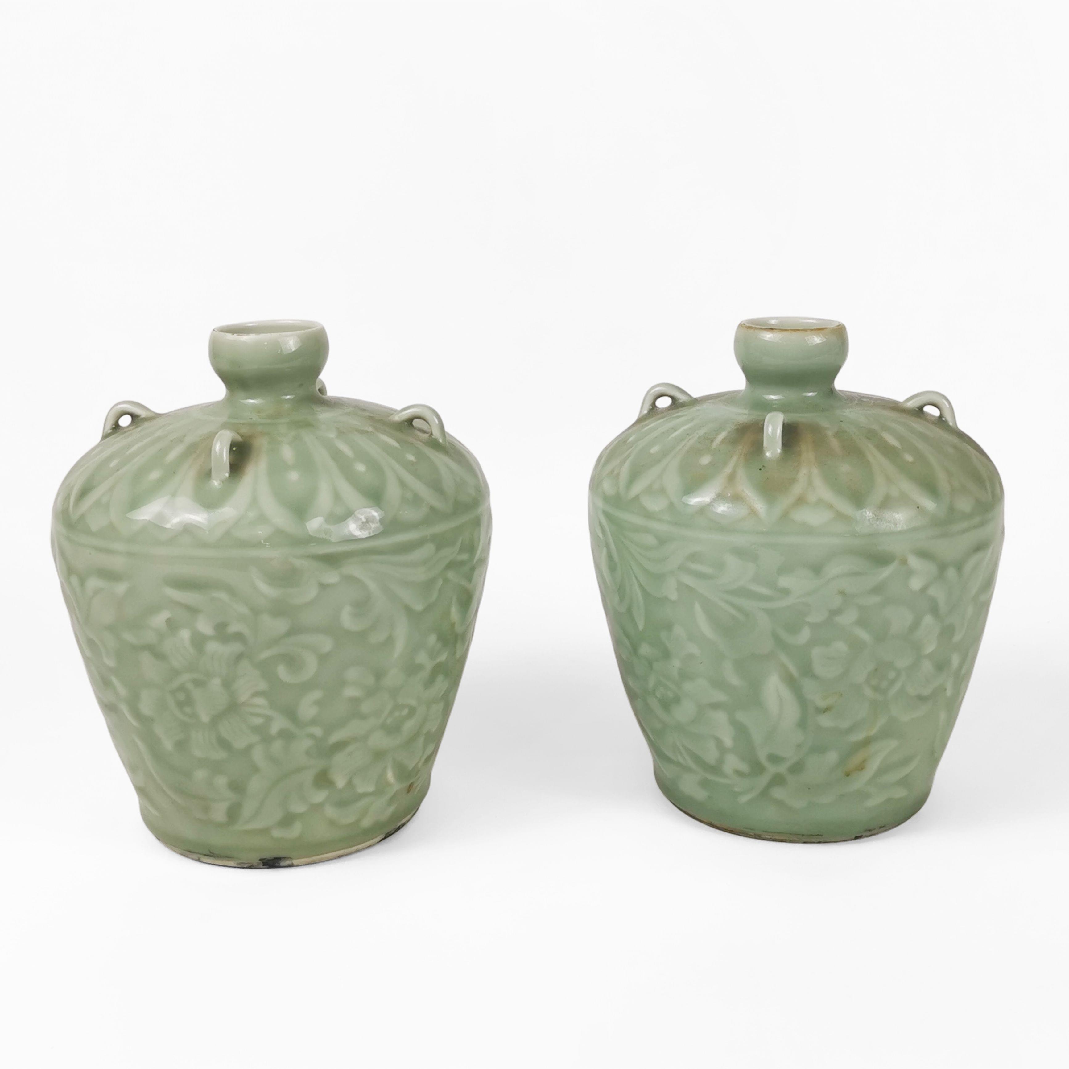 Porcelaine émaillé céladon, à décor en léger relief de fleurs, H 17 cm