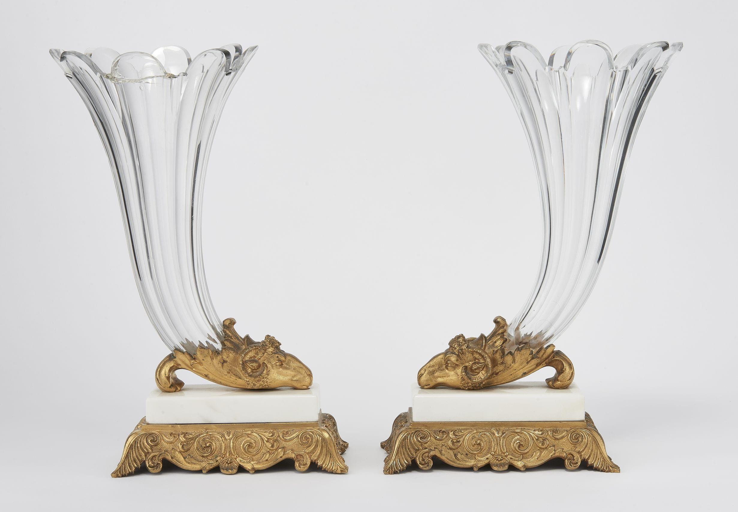 Cristal, bronze doré et marbre blanc, base en tête de bélier, H 32 cm