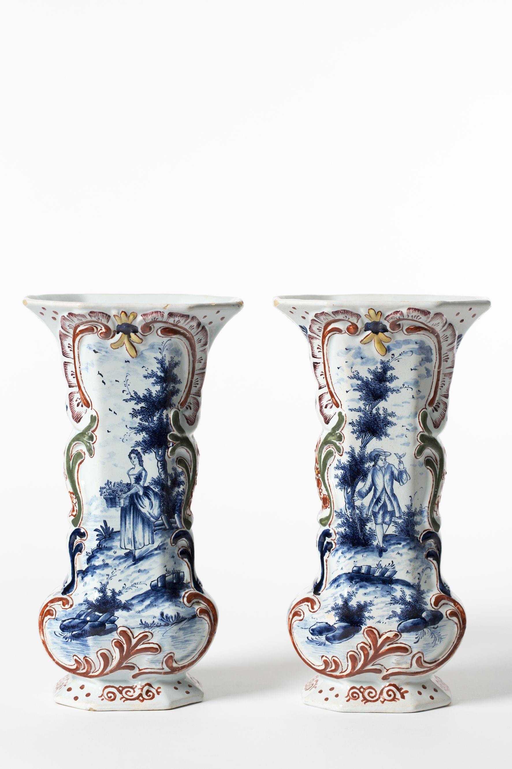 Faïence émaillée bleu blanc et rouge à décor de personnages et fleurs, H 26 cm