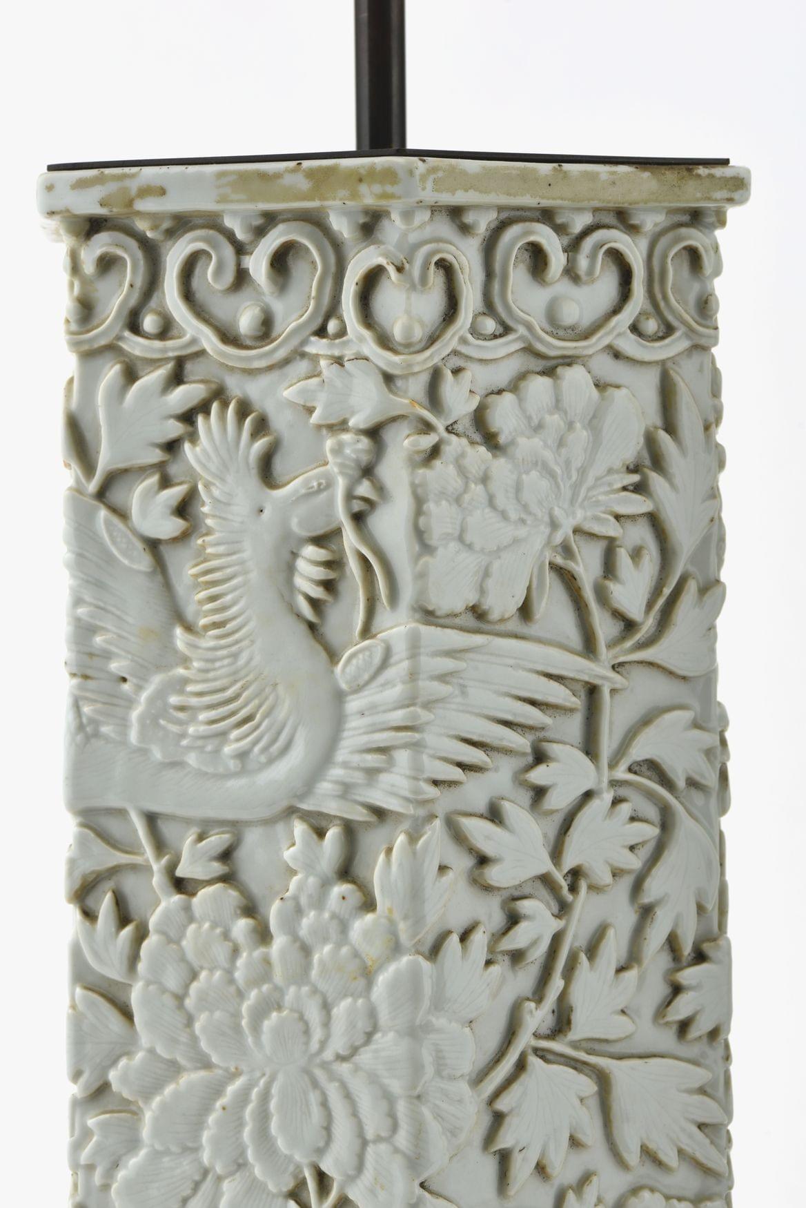 Porcelaine blanc de chine, Chine, dynastie Qing (1644-1911), H 40 cm (montés en lampe et percés)