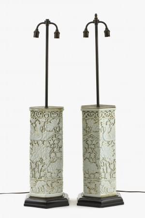 652. Paire de vases hexagonaux à décor en léger relief de phénix et feuillages