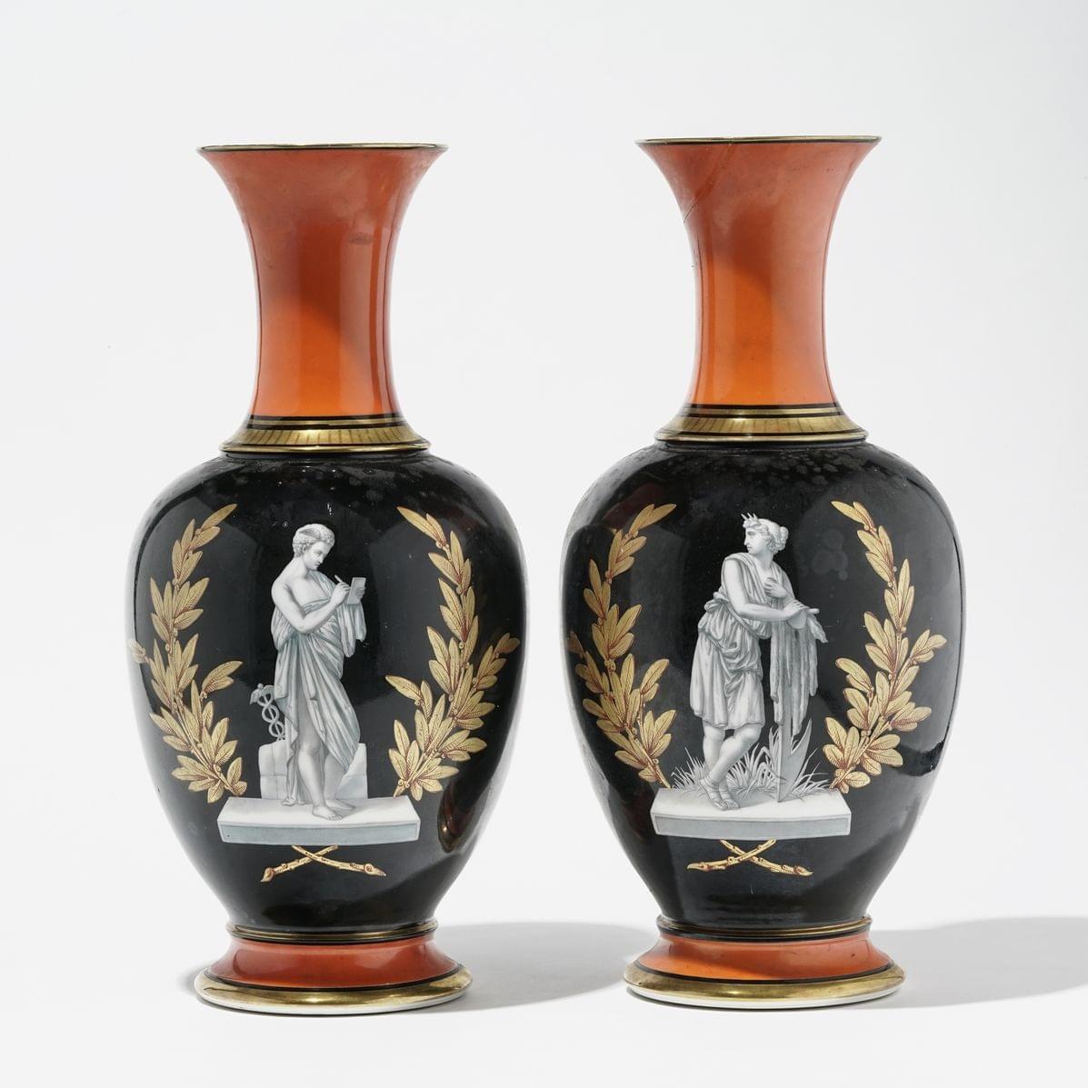 354. Paire de vases néoclassiques à décor de personnages à l'antique en grisaille sur fond noir, talon et col vermillon