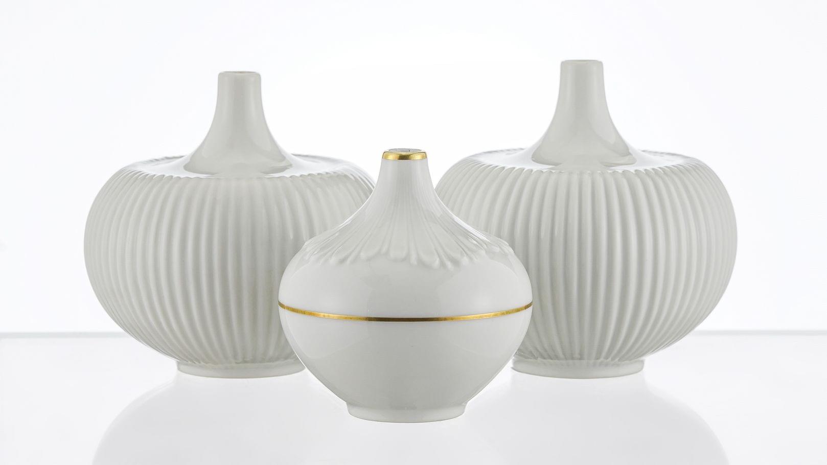 Porcelaine émaillée blanc, datés 55 et 69, H 10 cm. On joint un autre soliflore à godrons rayonnants, porcelaine émaillée blanc et filets dorés, Langenthal, H 8,5 cm
