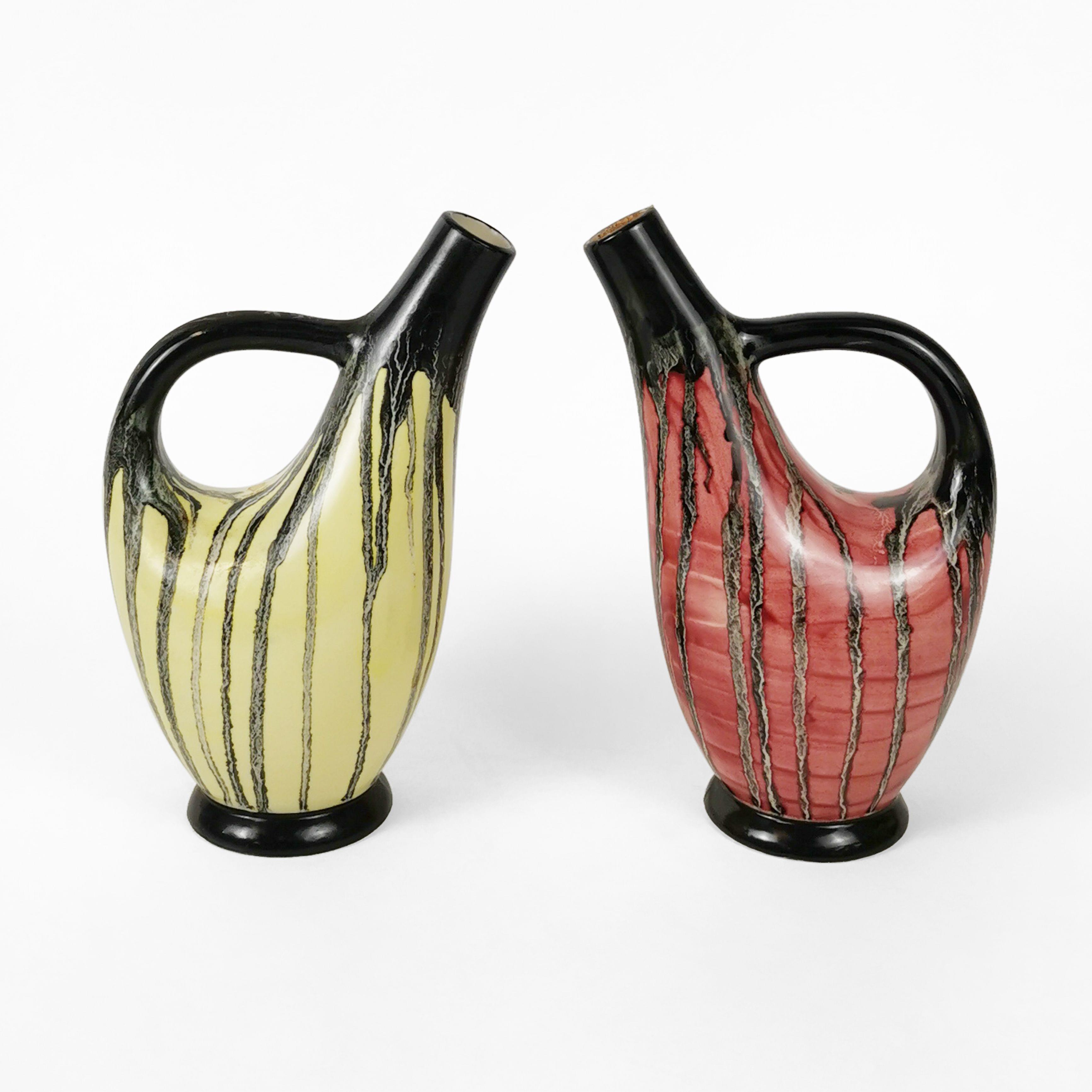 5208. Paire de verseuses à décor de coulures et 3 coupes à décor de poissons et formes géométriques
