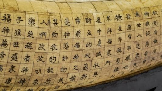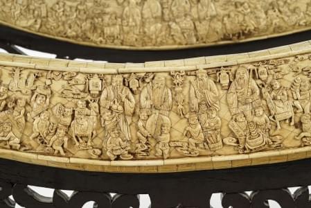 Plaques d'os sculptées à décor de personnages et dragons, L 150 cm