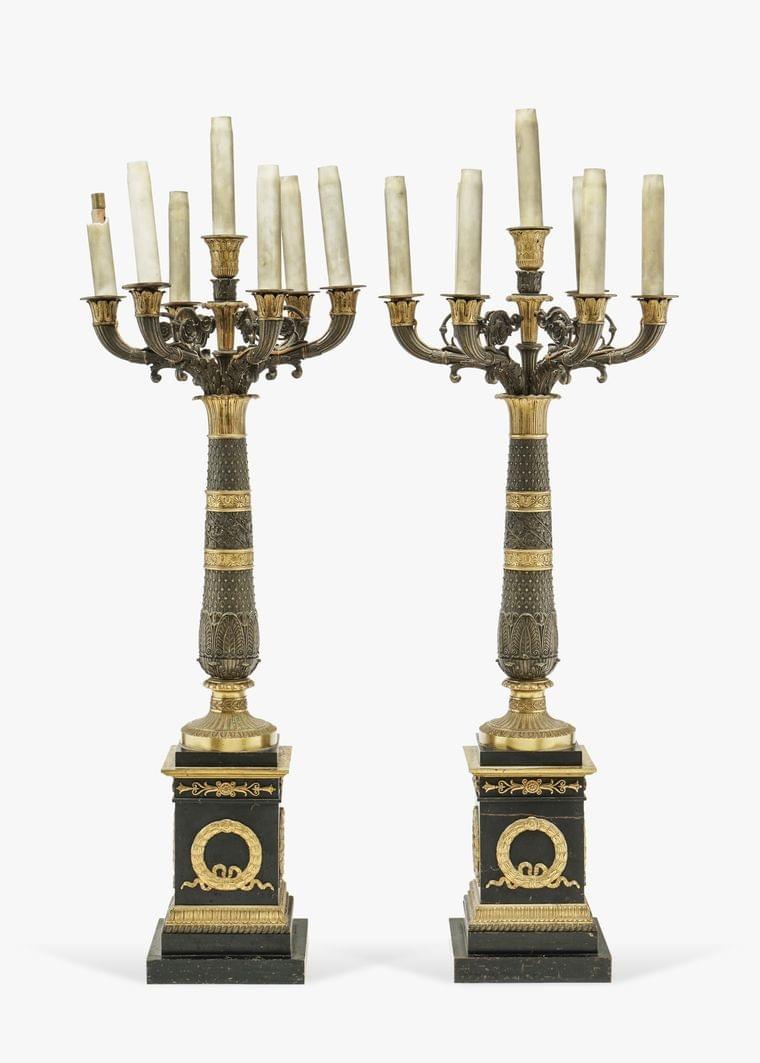 Cinq lumières, bronze à patine brune, doré et laqué noir, H 84 cm