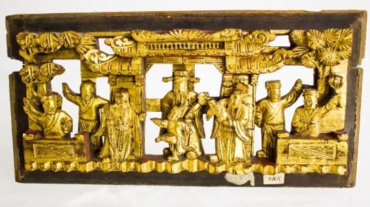 Bois sculpté, doré et laqué rouge, ajouré à décor d'une scène an...