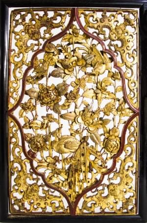 Bois sculpté, doré et laqué rouge, ajouré à décor d'oiseaux et f...