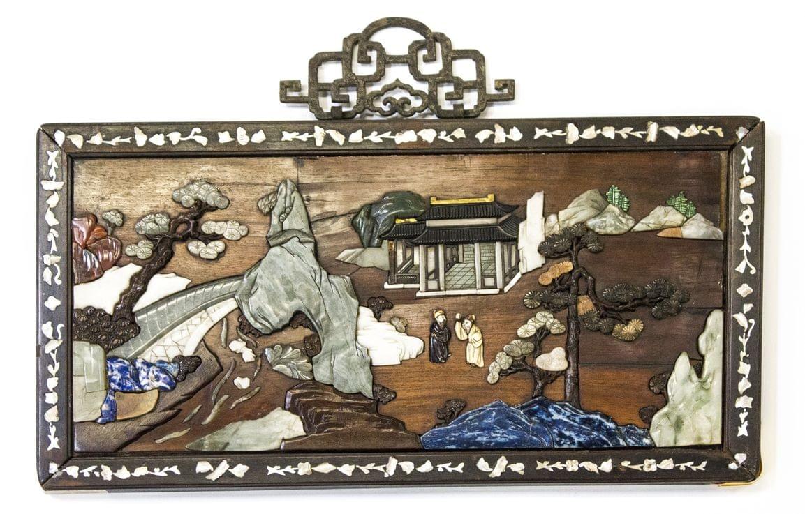 Pierres de lare, acajou et nacre à décor de paysage animé, Asie du Sud-Est, fin XIXe s, 59x41 cm