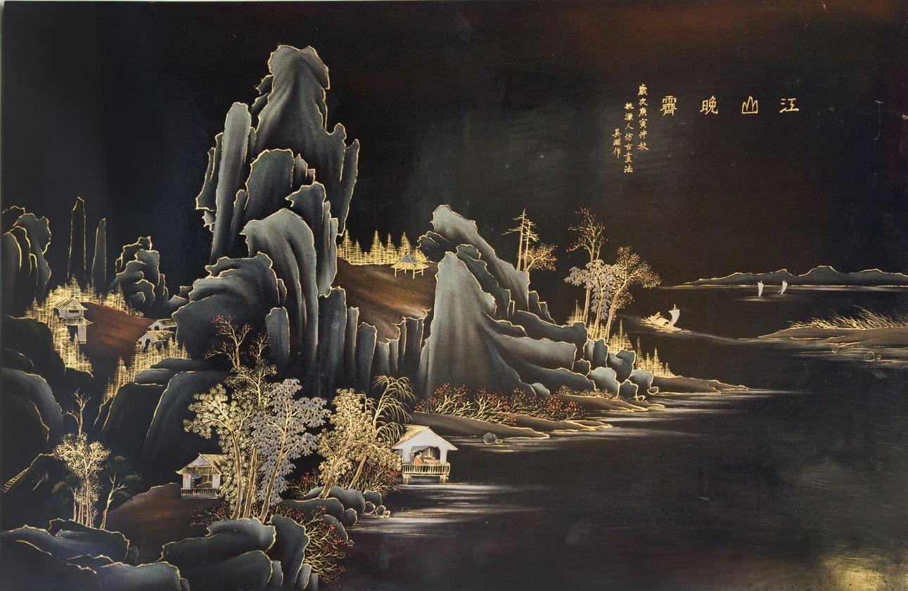 Pierres de lare, acajou et nacre à décor de paysage animé, Asie...