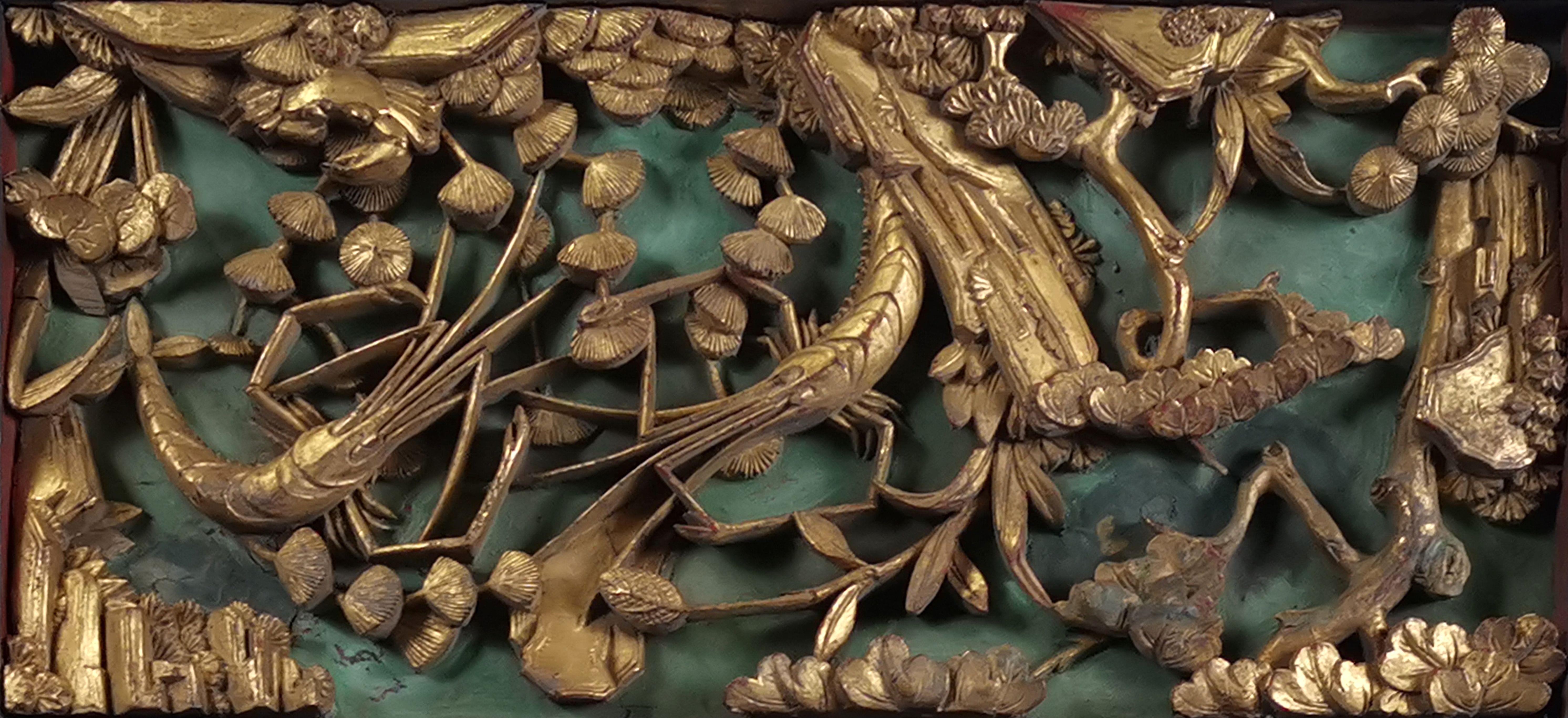 Bois sculpté et doré à décor de crevettes, 21x45 cm.