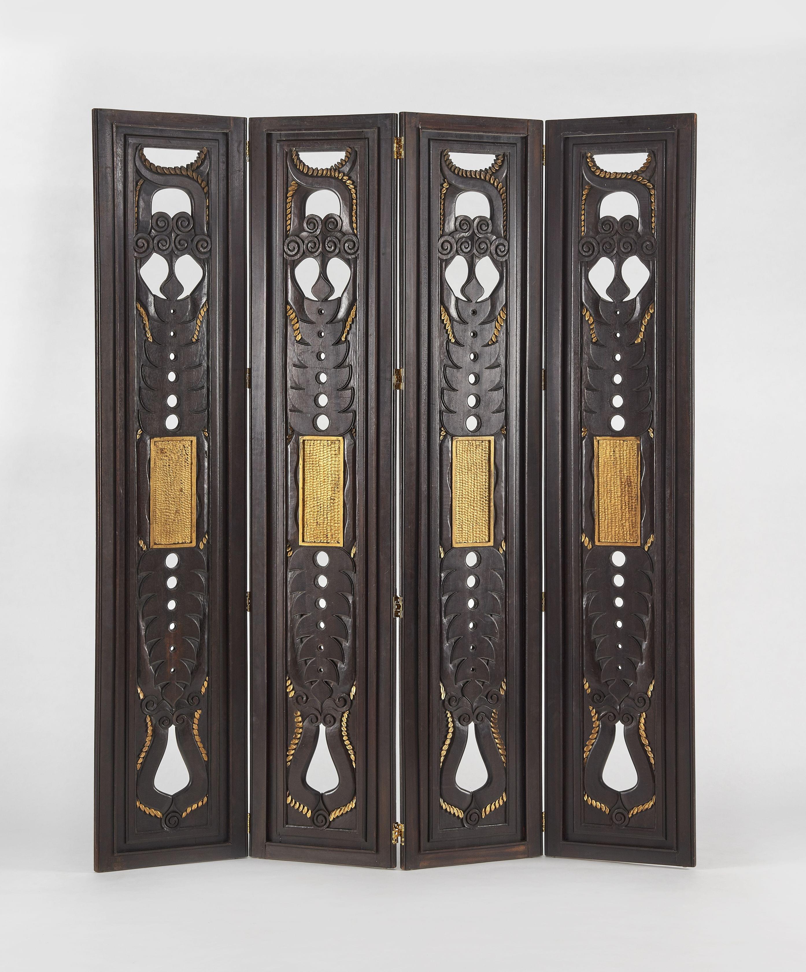 Bois fruitier à décor peint d'une ville surréaliste, porte un mo...