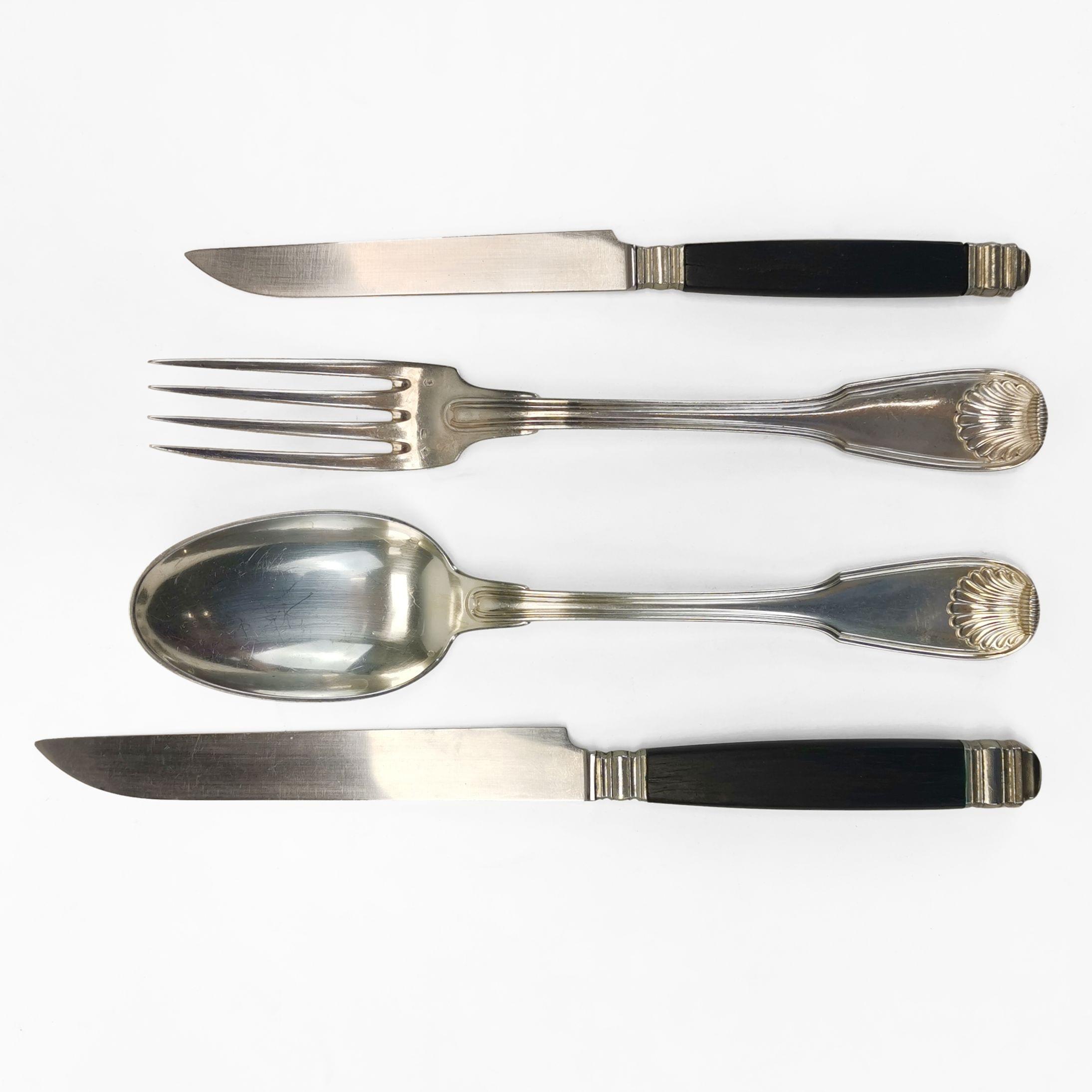 Puiforcat, argent 925, comprenant: 24 fourchettes à dîner et 18 cuillères à soupe, 3660 g. On joint 12 couteaux à dîner et 12 à entremets à manche ébène bagué de métal argenté.