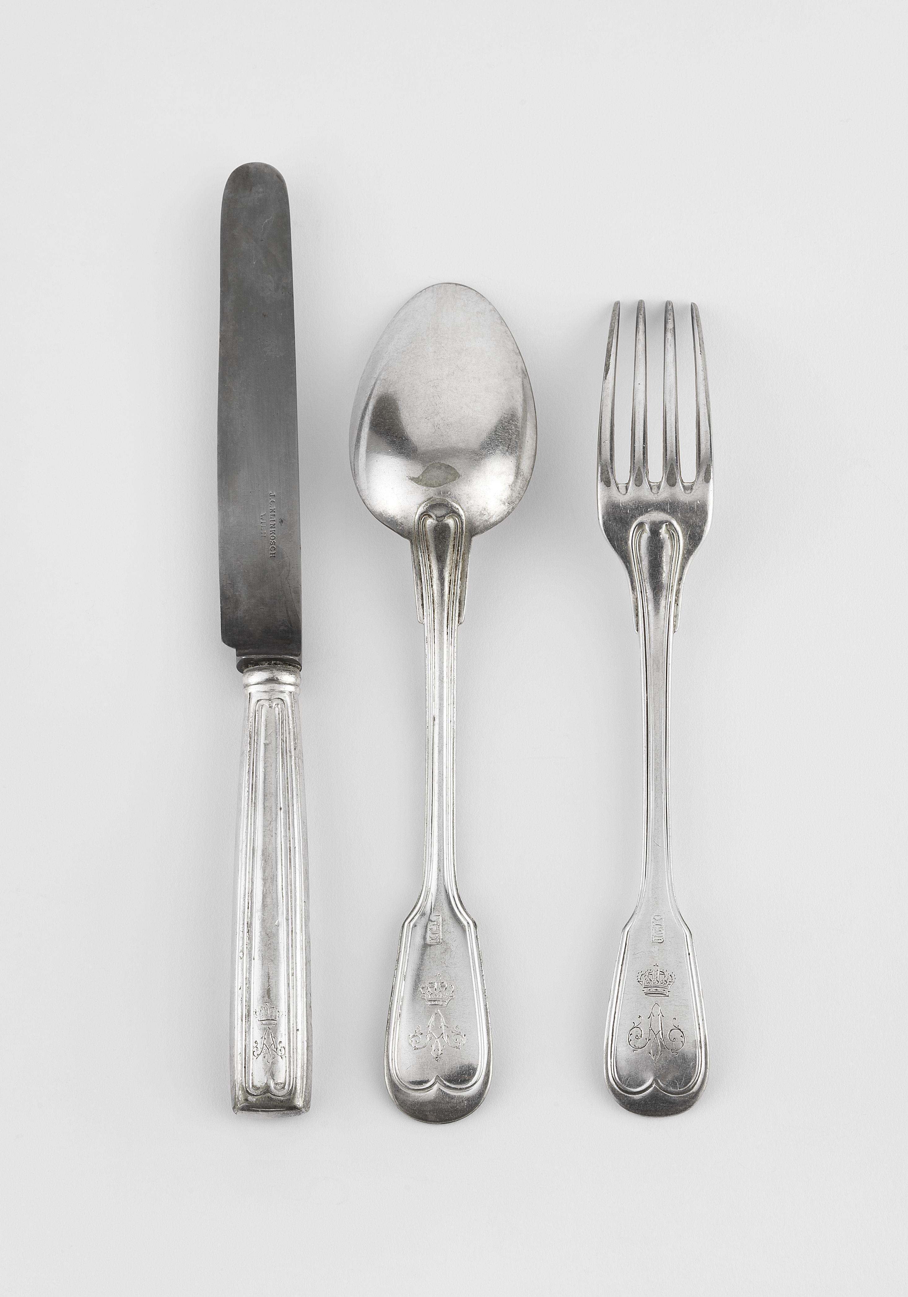 Joseph Carl Ritter von Klinkosch et Berndorf, Vienne, métal argenté, comprenant: 12 fourchettes, 8 cuillères et 10 couteaux, 890 g. Provenance Habsbourg: succession de l'archiduc Albert II d'Autrich-Teschen