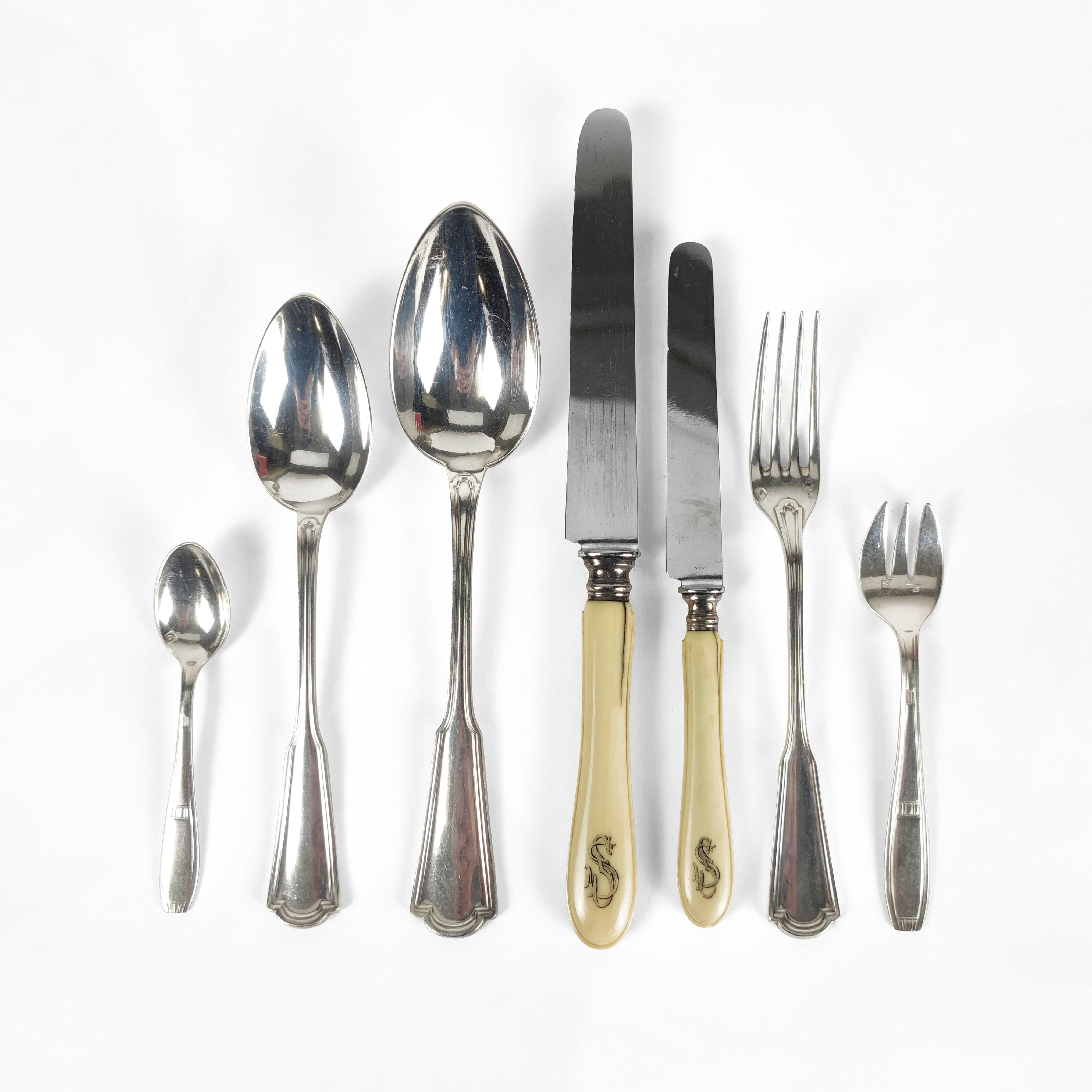 Pierre Quielle, France, argent, couteaux assortis à manche en ivoire, comprenant: 5 fourchettes, 6 cuillères et 6 couteaux à dîner, 6 fourchettes, 6 cuillères et 6 couteaux à entremets, 6 cuillères à thé. On joint 12 fourchettes à huître et 12 cuillères à moka, 6 couteaux à manche en bakélite, 1 couteau à pain, argent: 1770 g