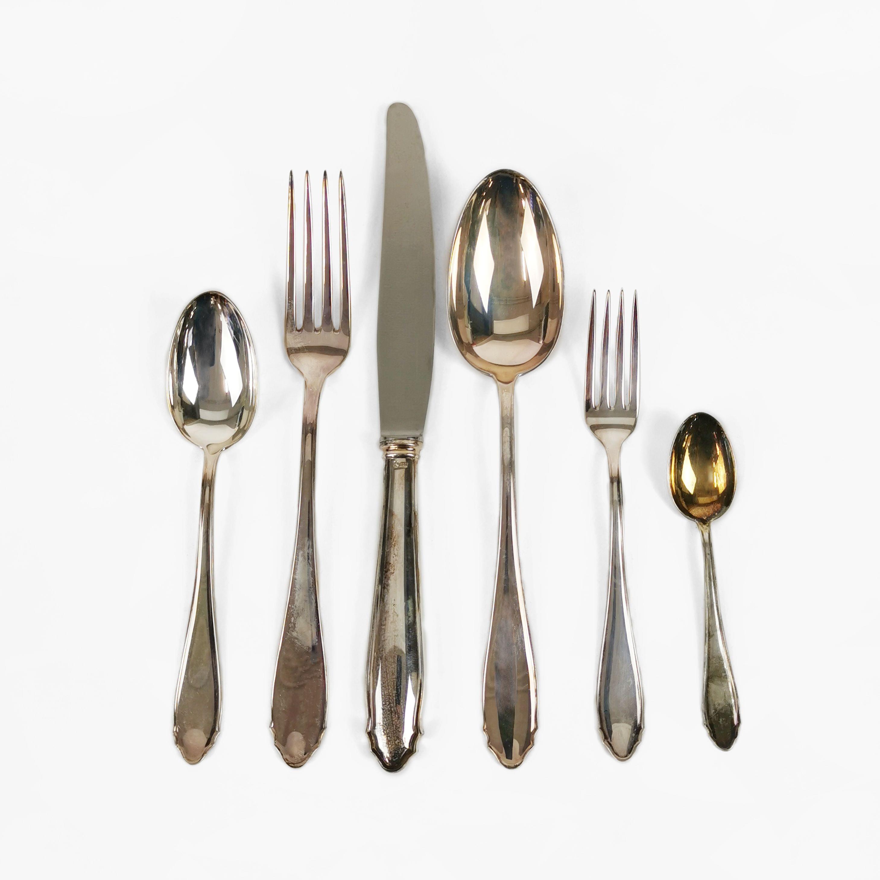 Jezler, argent 800, comprenant: 12 fourchettes, 7 couteaux et 12 cuillères de table, 8 fourchettes et 11 cuillères à entremets, 12 cuillères à thé, 12 cuillères à café, 2500 g